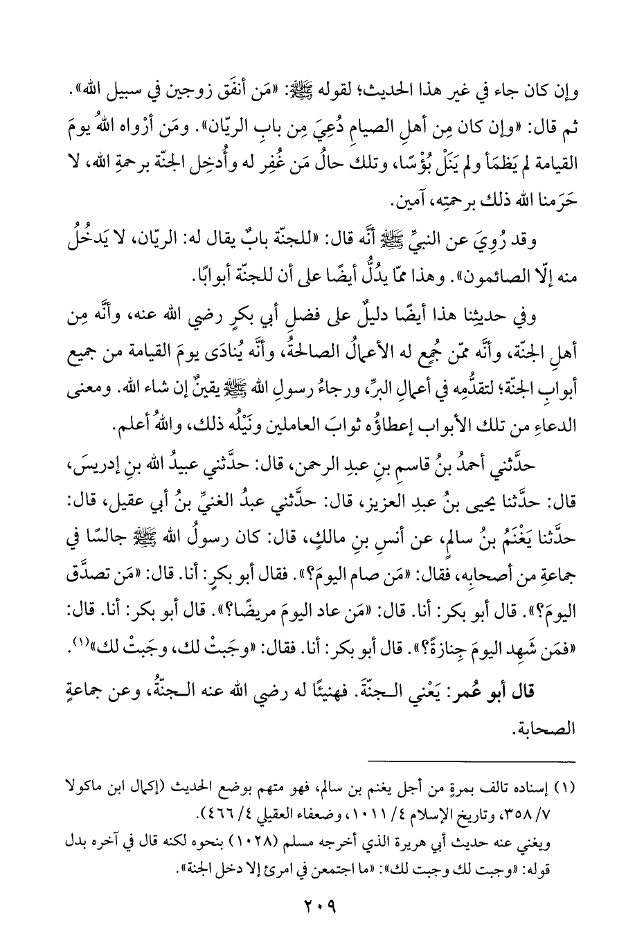حدَّثني أحمدُ بنُ قاسمِ بنِ عبدِ الرَّحمن، قال: حدَّثني عبيدُ الله بنِ إدريسَ، قال: حَدَّثَنَا يحيى بنُ عبدِ العزيز، قال: حدَّثني عبدُ الغنيِّ بنُ أبي عقيل، قال: حَدَّثَنَا يَغْنَمُ بنُ سالمٍ، عن أنسِ بنِ مالكٍ، قال: كان رسولُ الله - صَلَّى اللهُ عَلَيْهِ وَسَلَّمَ - جالسًا في جماعةِ من أصحابِه، فقال: "مَن صام اليومَ؟ ". فقال أبو بكرٍ: أنا. قال: "مَن تصدَّق اليومَ؟ ". قال أبو بكر: أنا. قال: "مَن عاد اليومَ مريضًا؟ ". قال أبو بكر: أنا. قال: "فمَن شَهِد اليومَ جِنازةً؟ ". قال أبو بكر: أنا. فقال: "وجَبتْ لك، وجَبتْ لك" (¬١).