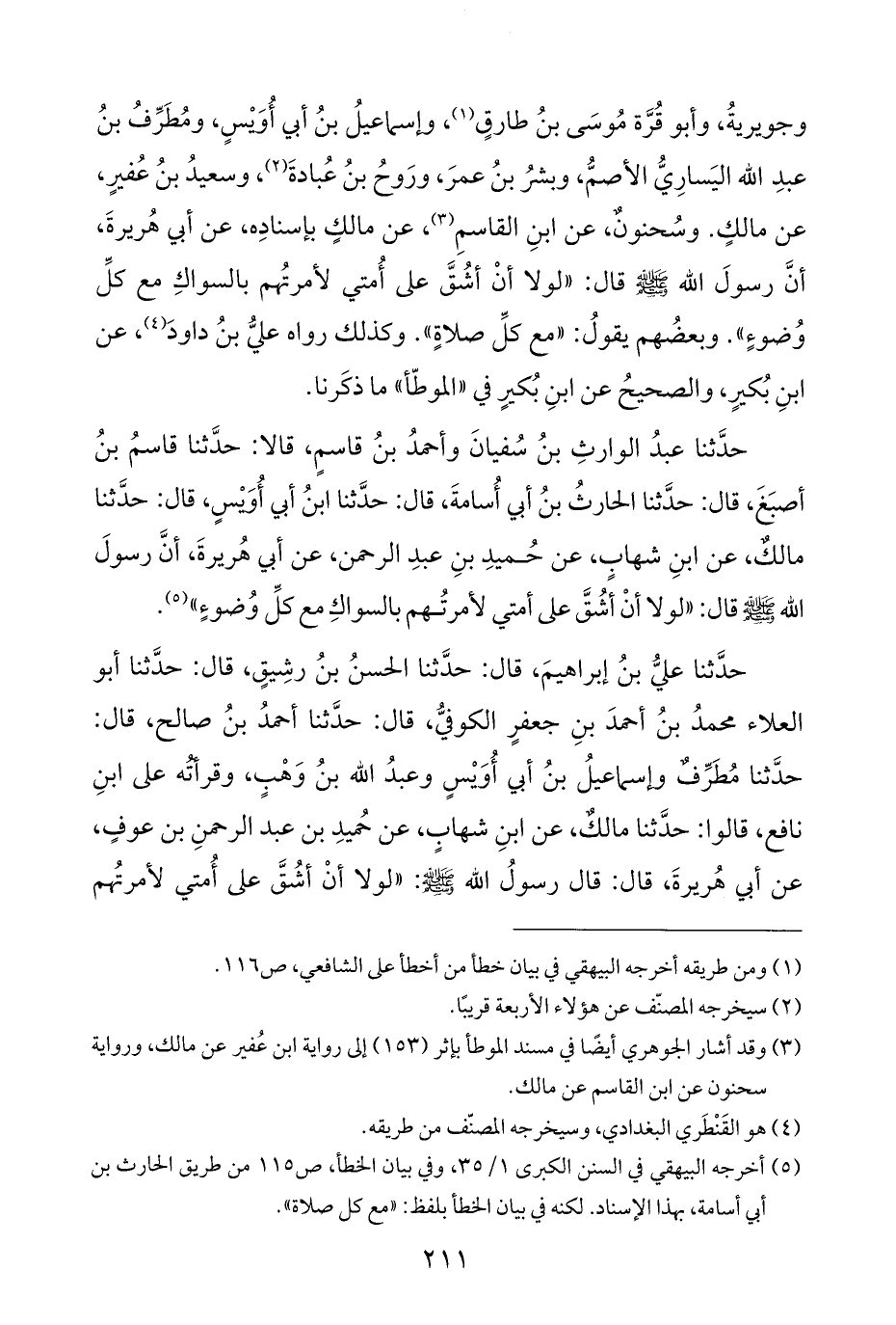 حَدَّثَنَا عليُّ بنُ إبراهيمَ، قال: حَدَّثَنَا الحسنُ بنُ رشِيقٍ، قال: حَدَّثَنَا أبو العلاء محمدُ بنُ أحمدَ بنِ جعفرٍ الكوفيُّ، قال: حَدَّثَنَا أحمدُ بنُ صالح، قال: حَدَّثَنَا مُطَرِّفٌ وإسماعيلُ بنُ أبي أُوَيْسٍ وعبدُ الله بنُ وَهْبٍ، وقرأتُه على ابنِ نافع، قالوا: حَدَّثَنَا مالكٌ، عن ابنِ شهابٍ، عن حُميدِ بن عبد الرحمنِ بن عوفٍ، عن أبي هُريرةَ، قال: قال رسولُ الله - صَلَّى اللهُ عَلَيْهِ وَسَلَّمَ -: "لولا أنْ أشُقَّ على أُمتي لأمرتُهم