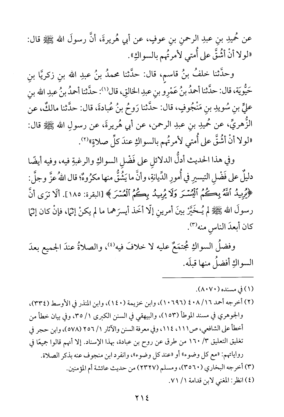 عن حُميدِ بنِ عبدِ الرحمنِ بنِ عوفٍ، عن أبي هُريرةَ، أنَّ رسولَ الله - صَلَّى اللهُ عَلَيْهِ وَسَلَّمَ - قال: "لولا أنْ أشُقَّ على أُمتي لأمرتُهم بالسواكِ".