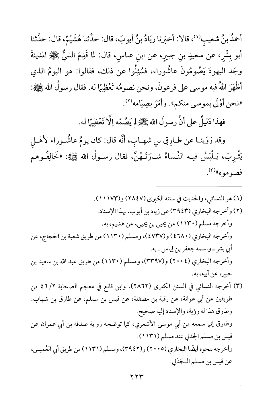 أحمدُ بنُ شعيبٍ (¬١)، قالا: أخبَرنا زيَادُ بنُ أيوبَ، قال: حَدَّثَنَا هُشَيْم، قال: حَدَّثَنَا أبو بِشْرٍ، عن سعيدٍ بنِ جبيرٍ، عن ابنِ عباسٍ، قال: لما قَدِمَ النبيُّ - صَلَّى اللهُ عَلَيْهِ وَسَلَّمَ - "المدينةَ وجَد اليهودَ يَصُومُونَ عاشُوراء، فسُئِلُوا عن ذلك، فقالوا: هو اليومُ الذي أظْهَرَ اللهُ فيه موسى على فرعونَ، ونحن نصومُه تَعْظِيمًا له. فقال رسولُ الله - صَلَّى اللهُ عَلَيْهِ وَسَلَّمَ -: "نحن أوْلَى بموسى منكم". وأمَرَ بصِيَامه (¬٢).