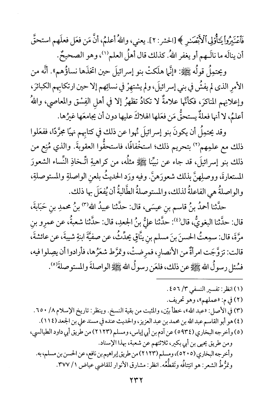 حَدَّثَنَا أحمدُ بنُ قاسم بنِ عيسَى، قال: حَدَّثَنَا عبيدُ الله (¬٣) بنُ محمدِ بنِ حَبَابةَ، قال: حَدَّثَنَا البغويُّ، قال (¬٤): حَدَّثَنَا عليُّ بنُ الجعدِ، قال: حَدَّثَنَا شعبةُ، عن عمرِو بنِ مرَّةَ، قال: سمِعتُ الحسنَ بنَ مسلم بنِ ينَّاقٍ يحدِّثُ، عن صفيَّةَ ابنةِ شيبةَ، عن عائشةَ، قالت: تزوَّجَت امرأةٌ من الأنصارِ، فمرِضتْ، وتمرَّط شعَرُها، فأرادوا أن يصلوا فيه، فسُئل رسولُ الله - صَلَّى اللهُ عَلَيْهِ وَسَلَّمَ - عن ذلك، فلعَن رسولُ الله - صَلَّى اللهُ عَلَيْهِ وَسَلَّمَ - الواصلةَ والمستوصلةَ (¬٥).
