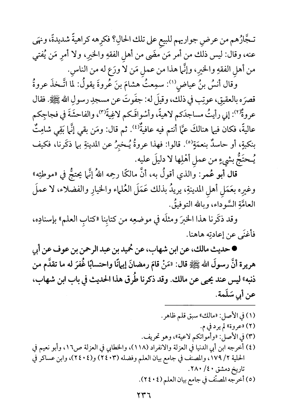 وقال أنسُ بنُ عياضٍ (¬١): سمِعتُ هشامَ بنَ عُروةَ يقولُ: لما اتَّخذَ عروةُ قصرَه بالعقيقِ، عوتِب في ذلك، وقيلَ له: جفَوتَ عن مسجدِ رسولِ الله - صلى الله عليه وسلم -. فقال عروةٌ (¬٢): إني رأيتُ مساجدَكم لاهيةً، وأسْواقَكم لاغِيةً (¬٣)، والفاحشَةَ في فجاجِكم عاليةً، فكان فيما هنالكَ عمَّا أنتم فيه عافيةٌ (¬٤). ثم قال: ومَن بقي إنَّما بَقِي شامِتٌ بنكبةٍ، أو حاسدٌ بنعمَةٍ (¬٥). قالوا: فهذا عروةُ يُخبِرُ عن المدينةِ بما ذكَرنا، فكيف يُحتَجُّ بشيءٍ من عملِ أهْلِها لا دليلَ عليه.