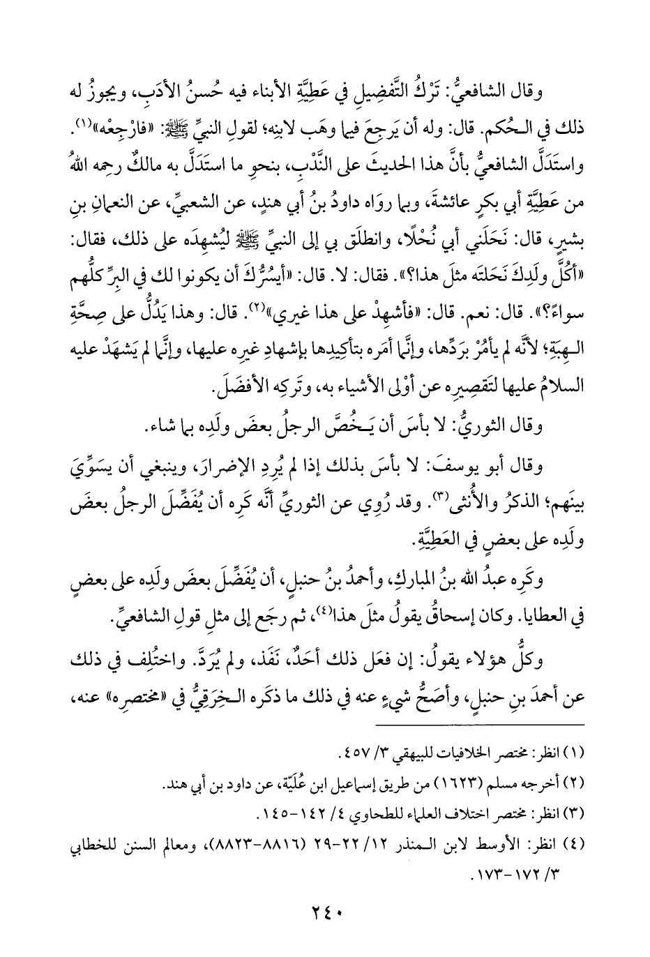 وكَرِه عبدُ الله بنُ المباركِ، وأحمدُ بنُ حنبلٍ، أن يُفَضِّلَ بعضَ ولَدِه على بعضٍ في العطايا. وكان إسحاقُ يقولُ مثلَ هذا (¬٤)، ثم رجَع إلى مثلِ قولِ الشافعيِّ.