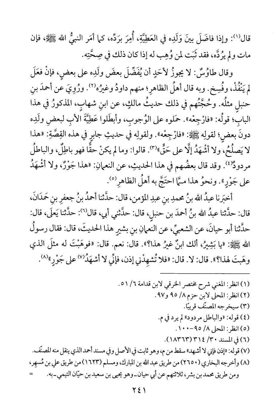 أخبَرنا عبدُ الله بنُ محمدِ بنِ عبدِ المؤمن، قال: حدَّثنا أحمدُ بنُ جعفرِ بنِ حَمدَانَ، قال: حدَّثنا عبدُ الله بنُ أحمدَ بن حنبلٍ، قال: حدَّثني أبي، قال (¬٦): حدَّثنا يَعلَى، قال: حدَّثنا أبو حيانَ، عن الشعبيِّ، عن النعمانِ بنِ بشيرٍ هذا الحديثَ، قال: فقال رسولُ الله - صلى الله عليه وسلم -: "يا بَشِيرُ، ألك ابنٌ غيرُ هذا؟ ". قال: نعم. قال: "فوهَبْتَ له مثلَ الذي وهَبتَ لهذا؟ ". قال: لا. قال: "فلا تُشهِدْني إذن، فإنِّي لا أشهَدُ (¬٧) على جَوْرٍ" (¬٨).
