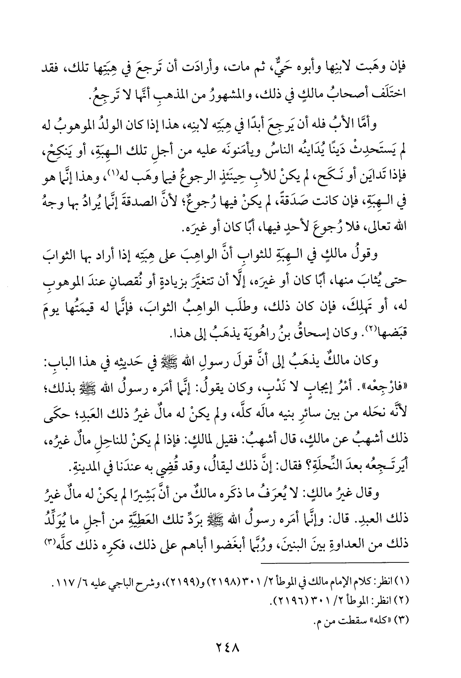 وكان مالكٌ يذهَبُ إلى أنَّ قولَ رسولِ الله - صلى الله عليه وسلم - في حَديثه في هذا البابِ: "فارْجِعْه". أمْرُ إيجابٍ لا نَدْبٍ، وكان يقولُ: إنَّما أمَره رسولُ الله - صلى الله عليه وسلم - بذلك؛ لأنَّه نحَله من بين سائرِ بنيه مالَه كلَّه، ولم يكنْ له مالٌ غيرُ ذلك العَبدِ؛ حكَى ذلك أشهبُ عن مالكٍ، قال أشهبُ: فقيل لمالكٍ: فإذا لم يكنْ للناحِلِ مالٌ غيرُه، أيرتَجِعُه بعدَ النِّحلَةِ؟ فقال: إنَّ ذلك ليقالُ، وقد قُضِي به عندَنا في المدينةِ.