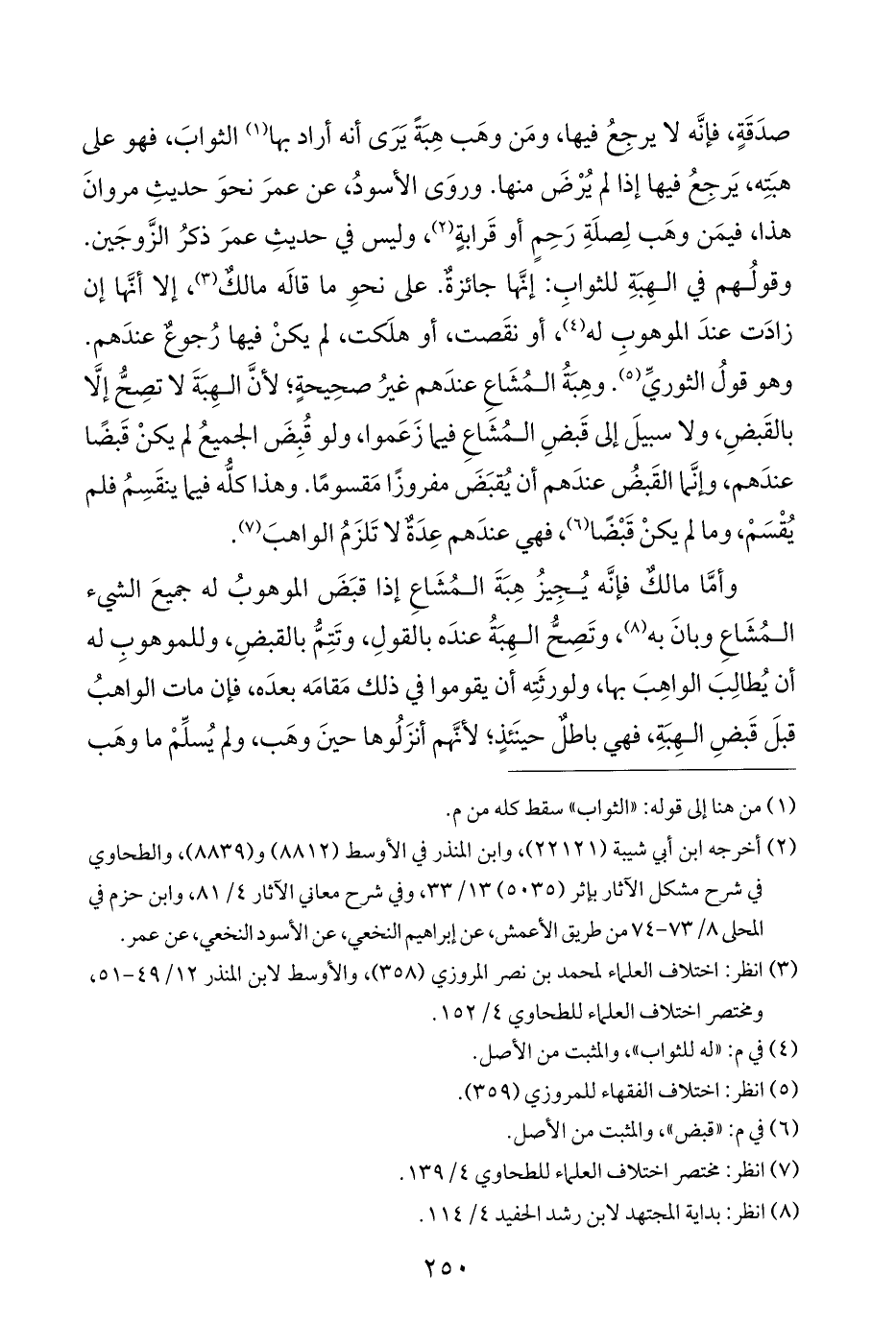 صدَقَةٍ، فإنَّه لا يرجعُ فيها، ومَن وهَب هِبَةً يَرَى أنه أراد بها (¬١) الثوابَ، فهو على هبَتِه، يَرجِعُ فيها إذا لم يُرْضَ منها. وروَى الأسودُ، عن عمرَ نحوَ حديثِ مروانَ هذا، فيمَن وهَب لِصلَةِ رَحِمٍ أو قَرابةٍ (¬٢)، وليس في حديثِ عمرَ ذكرُ الزَّوجَين. وقولُهم في الهِبَةِ للثوابِ: إنَّها جائزةٌ. على نحوِ ما قالَه مالكٌ (¬٣)، إلا أنَّها إن زادَت عندَ الموهوبِ له (¬٤)، أو نقَصت، أو هلَكت، لم يكنْ فيها رُجوعٌ عندَهم. وهو قولُ الثوريِّ (¬٥). وهِبَةُ المُشَاعِ عندَهم غيرُ صحِيحةٍ؛ لأنَّ الهِبَةَ لا تصِحُّ إلَّا بالقَبضِ، ولا سبيلَ إلى قَبضِ المُشَاعِ فيما زَعَموا، ولو قُبِضَ الجميعُ لم يكنْ قَبضًا عندَهم، وإنَّما القَبضُ عندَهم أن يُقبَضَ مفروزًا مَقسومًا. وهذا كلُّه فيما ينقَسِمُ فلم يُقْسَمْ، وما لم يكنْ قَبْضًا (¬٦)، فهي عندَهم عِدَةٌ لا تَلزَمُ الواهبَ (¬٧).