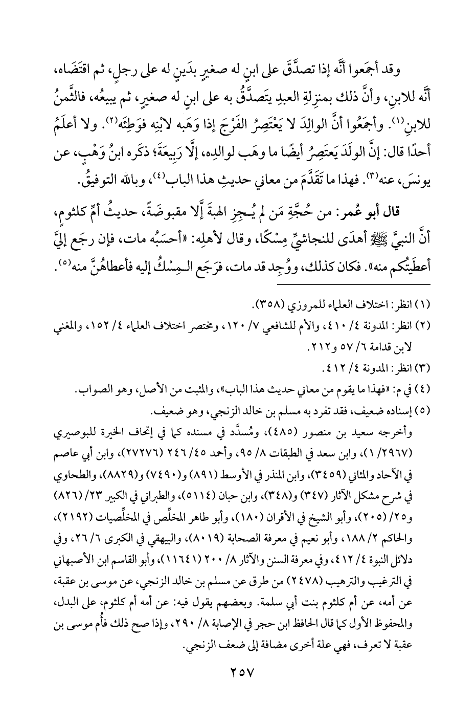 وقد أجمَعوا أنَّه إذا تصدَّقَ على ابنٍ له صغيرٍ بدَينٍ له على رجلٍ، ثم اقتَضَاه، أنه للابنِ، وأنَّ ذلك بمنزِلةِ العبدِ يتَصدَّقُ به على ابنٍ له صغيرٍ، ثم يبيعُه، فالثَّمنُ للابنِ (¬١). وأجمَعُوا أنَّ الوالِدَ لا يَعْتَصِرُ الفَرْجَ إذا وَهَبه لابْنِه فوَطِئَه (¬٢). ولا أعلَمُ أحدًا قال: إنَّ الولَدَ يَعتَصِرُ أيضًا ما وهَب لوالدِه، إلَّا رَبِيعَةَ؛ ذكَره ابنُ وَهْبٍ، عن يونسَ، عنه (¬٣). فهذا ما تَقَدَّمَ من معاني حديثِ هذا الباب (¬٤)، وبالله التوفيقُ.