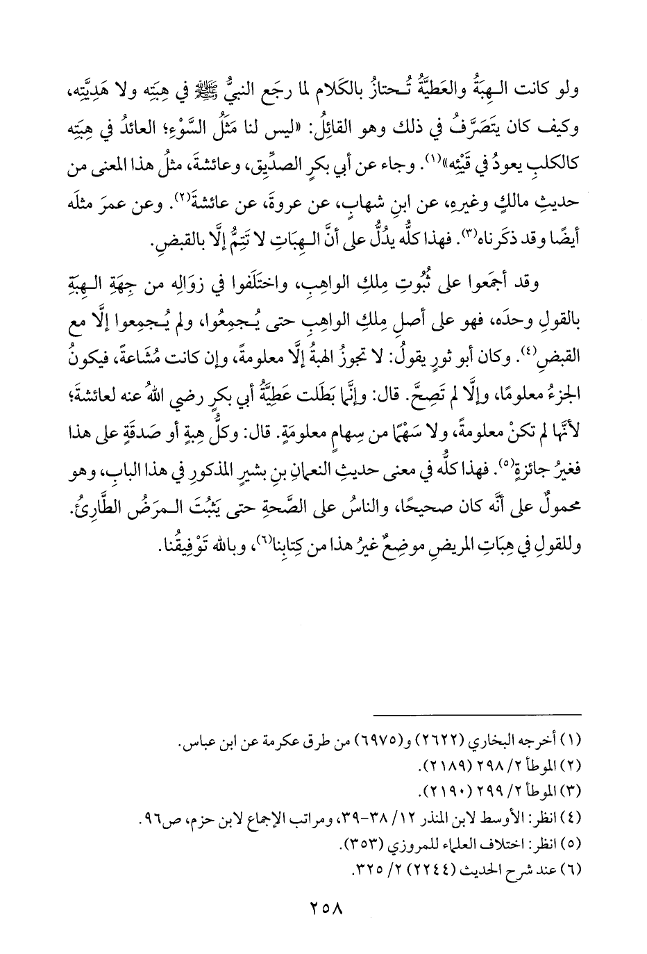 ولو كانت الهِبَةُ والعَطيَّةُ تُحتازُ بالكَلام لما رجَع النبيُّ - صلى الله عليه وسلم - في هِبَتِه ولا هَدِيَّته، وكيف كان يتَصَرَّفُ في ذلك وهو القائِلُ: "ليس لنا مَثَلُ السَّوْءِ؛ العائدُ في هِبَتِه كالكلبِ يعودُ في قَيْئه" (¬١). وجاء عن أبي بكرٍ الصدِّيِق، وعائشةَ، مثلُ هذا المعنى من حديثِ مالكٍ وغيرِه، عن ابنِ شهابٍ، عن عروةَ، عن عائشةَ (¬٢). وعن عمرَ مثلَه أيضًا وقد ذكَرناه (¬٣). فهذا كلُّه يدُلُّ على أنَّ الهِبَاتِ لا تَتِمُّ إلَّا بالقبضِ.