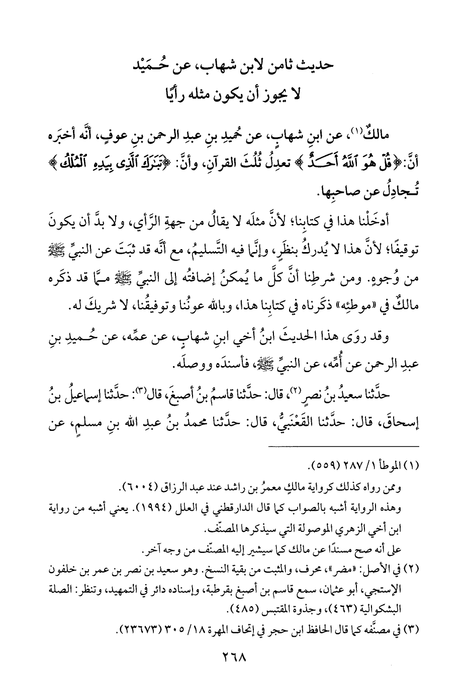 مالكٌ (¬١)، عن ابنِ شهابٍ، عن حُميدِ بنِ عبدِ الرحمن بنِ عوفٍ، أنَّه أخبَره أنَّ: {قُلْ هُوَ اللَّهُ أَحَدٌ} تعدِلُ ثُلُثَ القرآنِ، وأنَّ: {تَبَارَكَ الَّذِي بِيَدِهِ الْمُلْكُ} تُجادِلُ عن صاحبِها.