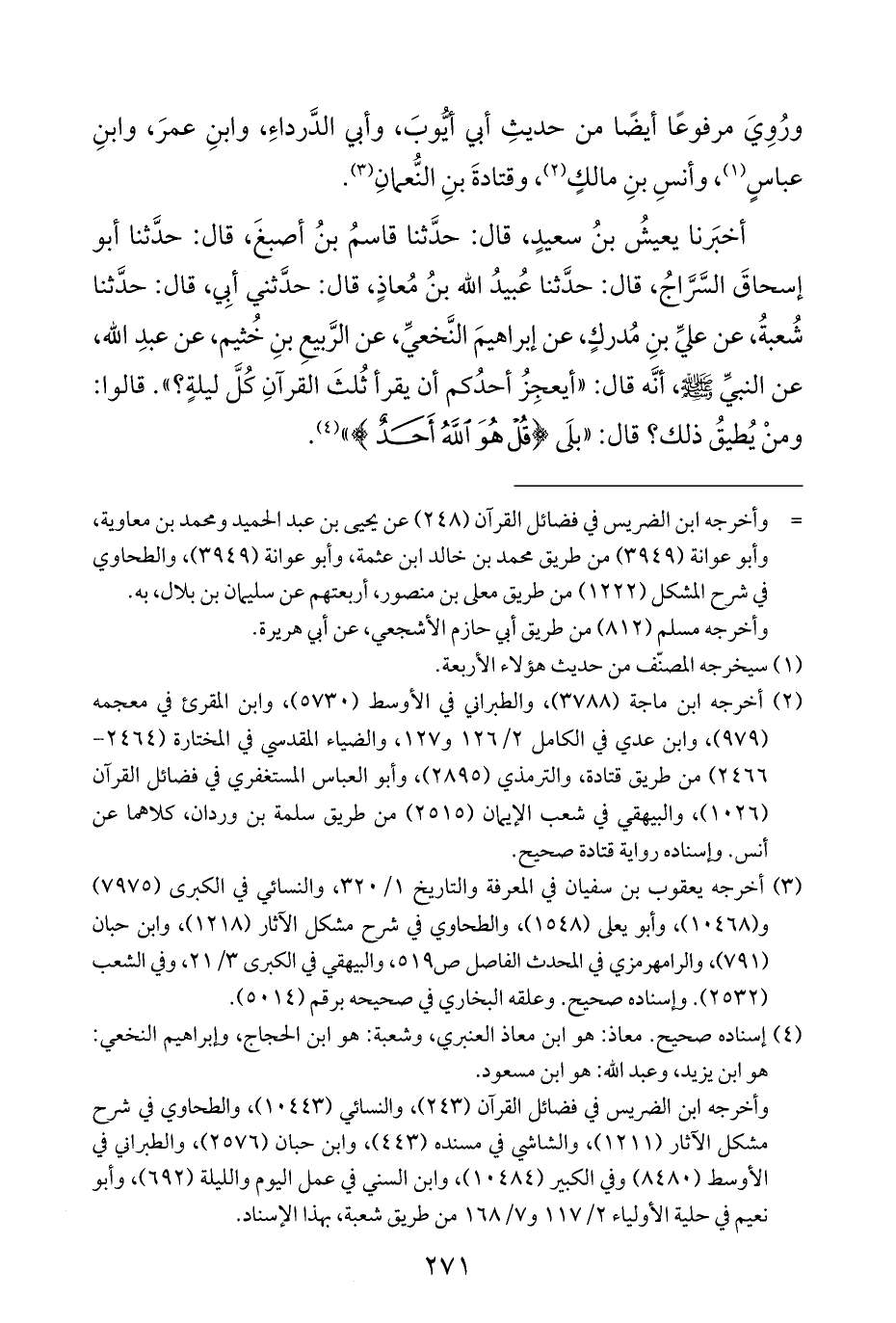 أخبَرنا يعيشُ بنُ سعيدٍ، قال: حدَّثنا قاسمُ بنُ أصبغَ، قال: حدَّثنا أبو إسحاق السَّرَّاجُ، قال: حدَّثنا عُبيدُ الله بنُ مُعاذٍ، قال: حدَّثني أبِي، قال: حدَّثنا شُعبةُ، عن عليِّ بنِ مُدركٍ، عن إبراهيمَ النَّخعيِّ، عن الرَّبيعِ بنِ خُثيم، عن عبدِ الله، عن النبيِّ - صلى الله عليه وسلم -، أنَّه قال: "أيعجِزُ أحدُكم أن يقرأ ثُلثَ القرآنِ كُلَّ ليلةٍ؟ ". قالوا: ومنْ يُطيقُ ذلك؟ قال: "بلَى {قُلْ هُوَ اللَّهُ أَحَدٌ} " (¬٤).