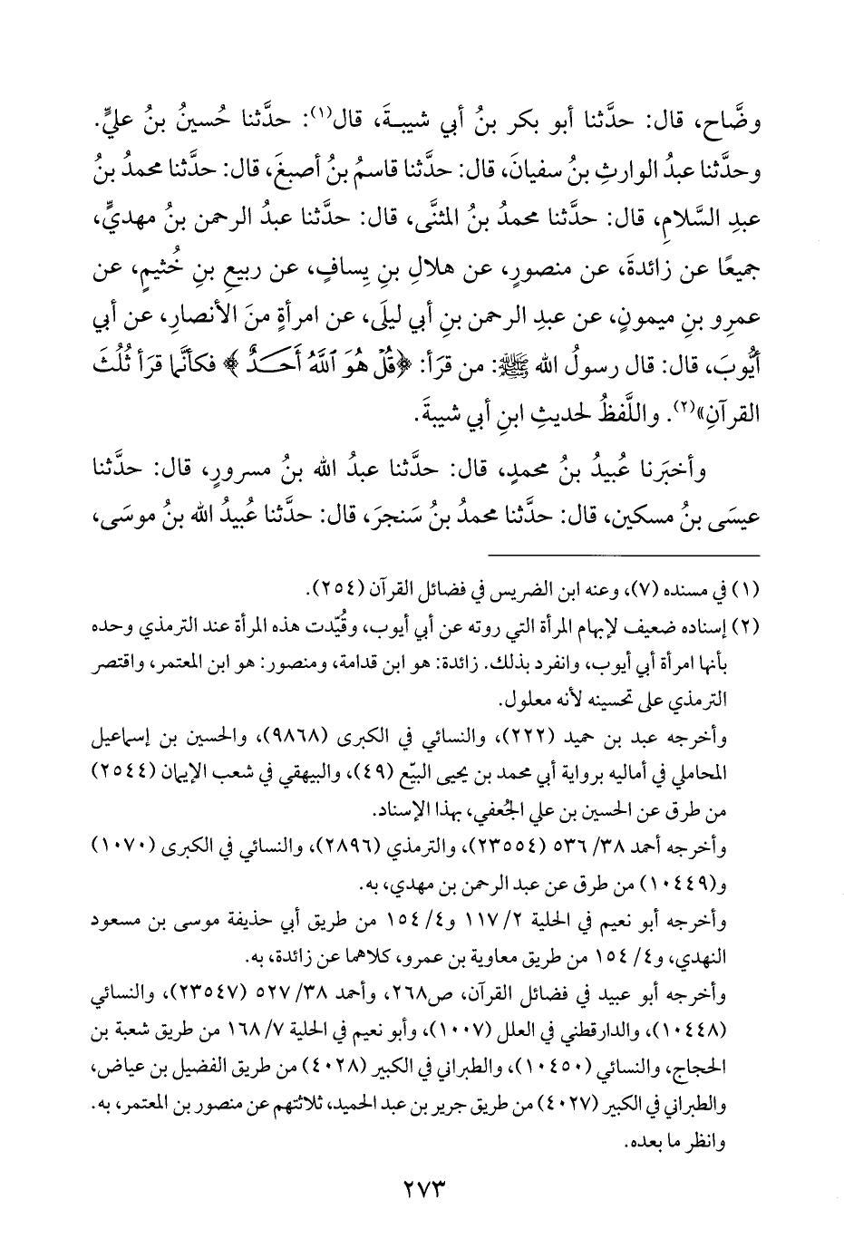 وضَّاح، قال: حدَّثنا أبو بكر بنُ أبي شيبةَ، قال (¬١): حدَّثنا حُسينُ بنُ عليٍّ. وحدَّثنا عبدُ الوارثِ بنُ سفيانَ، قال: حدَّثنا قاسمُ بنُ أصبغَ، قال: حدَّثنا محمدُ بنُ عبدِ السَّلامِ، قال: حدَّثنا محمدُ بنُ المثنَّى، قال: حدَّثنا عبدُ الرحمن بنُ مهديٍّ، جميعًا عن زائدةَ، عن منصورٍ، عن هلالِ بنِ يِسافٍ، عن ربيعِ بنِ خُثيمٍ، عن عمرِو بنِ ميمونٍ، عن عبدِ الرحمن بنِ أبي ليلَى، عن امرأةٍ منَ الأنصارِ، عن أبي أيُّوبَ، قال: قال رسولُ الله - صلى الله عليه وسلم -: من قرَأ: {قُلْ هُوَ اللَّهُ أَحَدٌ} فكأنَّما قرَأ ثُلُثَ القرآنِ" (¬٢). واللَّفظُ لحديثِ ابنِ أبي شيبةَ.