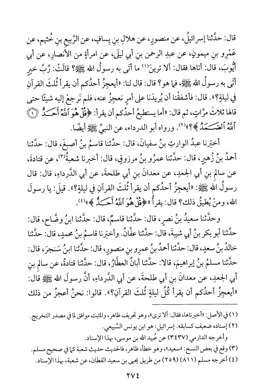 وحدَّثنا سعيدُ بنُ نصرٍ، قال: حدَّثنا قاسمٌ، قال: حدَّثنا ابنُ وضَّاح، قال: حدَّثنا أبو بكر بنُ أبي شيبةَ، قال: حدَّثنا عفَّانُ. وأخبَرنا قاسمُ بنُ محمدٍ، قال: حدَّثنا خالدُ بنُ سعدٍ، قال: حدَّثنا أحمدُ بنُ عمرِو بنِ منصورٍ، قال: حدَّثنا ابنُ سَنجرَ، قال: حدَّثنا مسلمُ بنُ إبراهيمَ، قالا: حدَّثنا أبان العطَّارُ، قال: حدَّثنا قتادةُ، عن سالمِ بنِ أبي الجعدِ، عن معدانَ بنِ أبي طلحةَ، عن أبي الدَّرداءِ، أنَّ رسولَ الله - صلى الله عليه وسلم - قال: "أيعجِزُ أحدُكم أن يقرأ كُلَّ ليلةٍ ثُلثَ القرآنِ؟ ". قالوا: نحنُ أعجزُ من ذلك