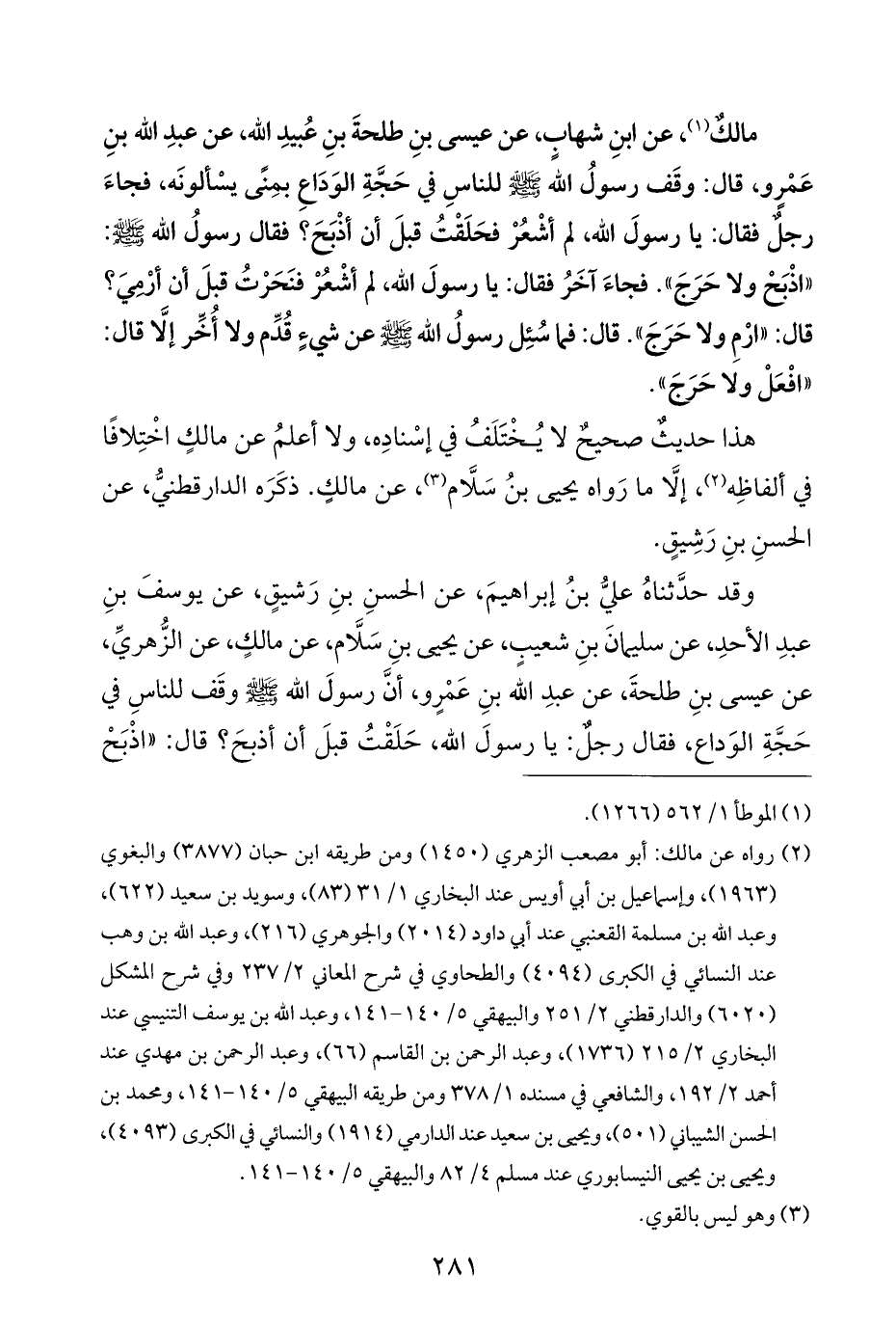 وقد حدَّثناهُ عليُّ بنُ إبراهيمَ، عن الحسنِ بنِ رَشيقٍ، عن يوسفَ بنِ عبدِ الأحدِ، عن سليمانَ بنِ شعيبِ، عن يحيى بنِ سَلَّام، عن مالكٍ، عن الزُّهريِّ، عن عيسى بنِ طلحةَ، عن عبدِ اللَّه بنِ عَمْرٍو، أنَّ رسولَ الله - صلى الله عليه وسلم - وقَف للناسِ في حَجَّةِ الوَداع، فقال رجلٌ: يا رسولَ الله، حَلَقْتُ قبلَ أن أذبحَ؟ قال: "اذْبَحْ