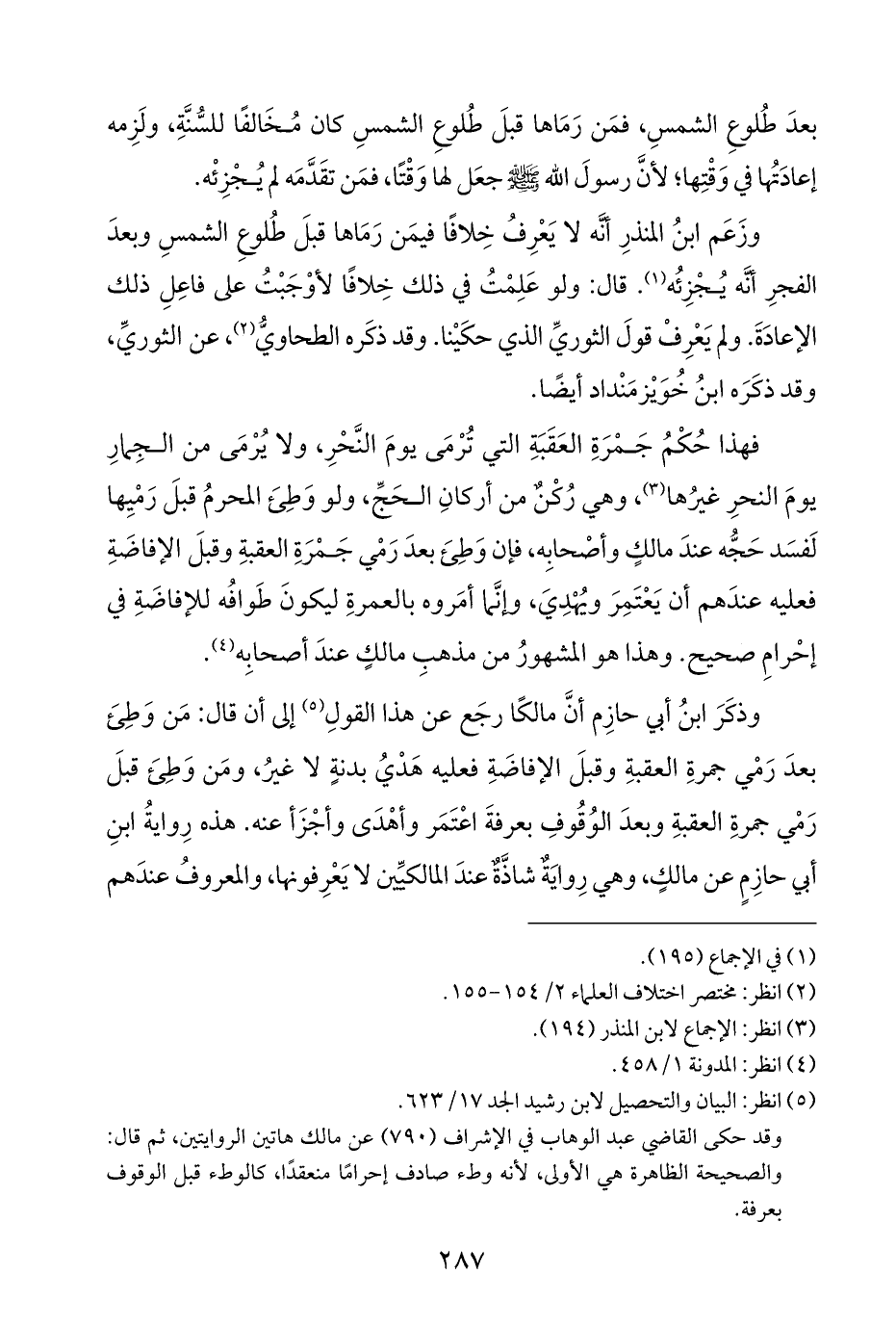 وزَعَم ابنُ المنذرِ أنَّه لا يَعْرِفُ خِلافًا فيمَن رَمَاها قبلَ طُلوعِ الشمسِ وبعدَ الفجرِ أنَّه يُجْزِئُه (¬١). قال: ولو عَلِمْتُ في ذلك خِلافًا لأوْجَبْتُ على فاعِلِ ذلك الإعادَةَ. ولم يَعْرِفْ قولَ الثوريِّ الذي حكَيْنا. وقد ذكَره الطحاويُّ (¬٢)، عن الثوريِّ، وقد ذكَرَه ابنُ خُوَيْز مَنْداد أيضًا.