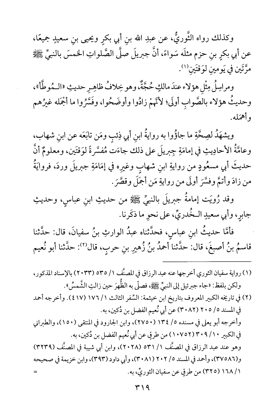 وكذلك رواه الثَّوريُّ، عن عبدِ الله بنِ أبي بكرٍ ويحيى بنِ سعيدٍ جميعًا، عن أبي بكرٍ بنِ حزم مثلَه سَواءً، أنَّ جبريلَ صلَّى الصَّلواتِ الخمسَ بالنبيِّ - صلى الله عليه وسلم - مرَّتَين في يَومينِ لوَقتَينِ (¬١).