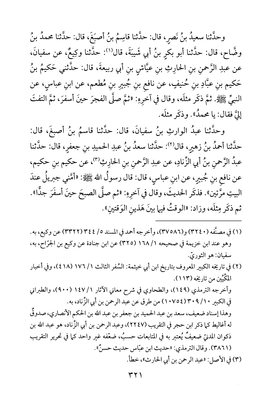 وحدَّثنا سعيدُ بنُ نَصرٍ، قال: حدَّثنا قاسِمُ بنُ أصبَغَ، قال: حدَّثنا محمدُ بنُ وضَّاح، قال: حدَّثنا أبو بكرٍ بنُ أبي شَيبَةَ، قال (¬١): حدَّثنا وكِيعٌ، عن سفيانَ، عن عبدِ الرَّحمنِ بنِ الحارِثِ بنِ عيَّاشٍ بنِ أبي ربيعةَ، قال: حدَّثني حَكيمُ بنُ حَكيم بنِ عبَّادِ بنِ حُنيفٍ، عن نافعِ بنِ جُبيرِ بنِ مُطعم، عن ابنِ عباسٍ، عن النبيِّ - صلى الله عليه وسلم -. ثمَّ ذكَر مثلَه، وقال في آخرِهِ: "ثمَّ صلَّى الفجرَ حينَ أسفرَ، ثمَّ التفتَ إليَّ فقال: يا محمدُ". وذكَر مثلَه.