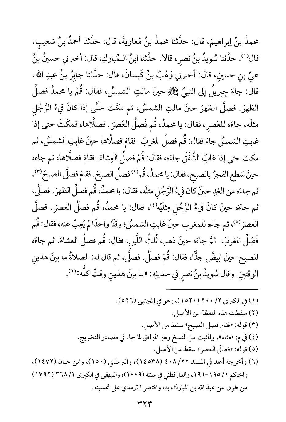 محمدُ بنُ إبراهيمَ، قال: حدَّثنا محمدُ بنُ مُعاويةَ، قال: حدَّثنا أحمدُ بنُ شعيبٍ، قال (¬١): حدَّثنا سُويدُ بنُ نصرٍ، قالا: حدَّثنا ابنُ المُباركِ، قال: أخبرني حسينُ بنُ عليِّ بنِ حسينٍ، قال: أخبرني وَهْبُ بنُ كَيسانَ، قال: حدَّثنا جابِرُ بنُ عبدِ الله، قال: جاءَ جِبريلُ إلى النبيِّ - صلى الله عليه وسلم - حينَ مالتِ الشمسُ، فقال: قُمْ يا محمدُ فصلِّ الظهرَ. فصلَّى الظهرَ حينَ مالتِ الشمسُ، ثم مكَث حتَّى إذا كانَ فيءُ الرَّجُلِ مثلَه، جاءَه للعَصرِ، فقال: يا محمدُ، قُم فَصلِّ العَصَر. فصلَّاها، فمكَثَ حتى إذا غابتِ الشمسُ جاءَ فقال: قُم فصلِّ المغربَ. فقامَ فصلَّاها حينَ غابتِ الشمسُ، ثم مكث حتى إذا غابَ الشَّفَقُ جاءَه، فقال: قُمْ فصلِّ العِشاءَ. فقامَ فصلَّاها، ثم جاءه حينَ سَطع الفجرُ بالصبحِ، فقال: يا محمدُ، قُم (¬٢) فصلِّ الصبحَ. فقامَ فصلَّى الصبحَ (¬٣)، ثم جاءَه من الغدِحينَ كان فيءُ الرَّجُلِ مثلَه، فقال: يا محمدُ، قُم فصلِّ الظهرَ. فصلَّى، ثم جاءَه حينَ كانَ فيءُ الرَّجُلِ مِثلَيْه (¬٤)، فقال: يا محمدُ، قُم فصلِّ العصرَ. فصلَّى العصرَ (¬٥)، ثم جاءه للمغربِ حينَ غابتِ الشمسُ؛ وقتًا واحدًا لم يَغِبْ عنه، فقال: قُم فَصَلِّ المغربَ. ثمَّ جاءَه حينَ ذهب ثُلثُ اللَّيلِ، فقال: قُم فصلِّ العشاءَ. ثم جاءَه للصبح حينَ ابيضَّ جدًّا، فقال: قُمْ فصلِّ. فصلى، ثم قال له: الصلاةُ ما بينَ هذينِ الوقتينِ. وقال سُويدُ بنُ نصرٍ في حديثِه: "ما بينَ هذينِ وقتٌ كلُّه" (¬٦).