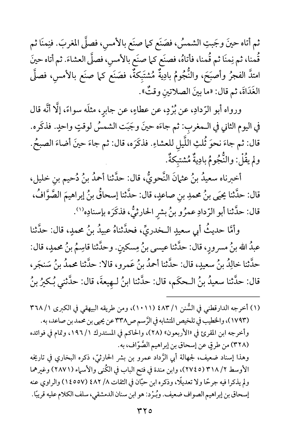 ورواه أبو الرّدادِ، عن بُرْدٍ، عن عطاءٍ، عن جابرٍ، مثلَه سواءً، إلَّا أنَّه قال في اليوم الثاني في المغربِ: ثم جاءَه حينَ وجَبَت الشمسُ لوقتٍ واحدٍ. فذكَره. قال: ثم جاءَ نحوَ ثُلثِ اللَّيلِ للعشاءِ. فذكَرَه، قال: ثم جاءَ حينَ أضاءَ الصبحُ. ولم يقُلْ: والنُّجُومُ بادِيةٌ مُشتبِكةٌ.