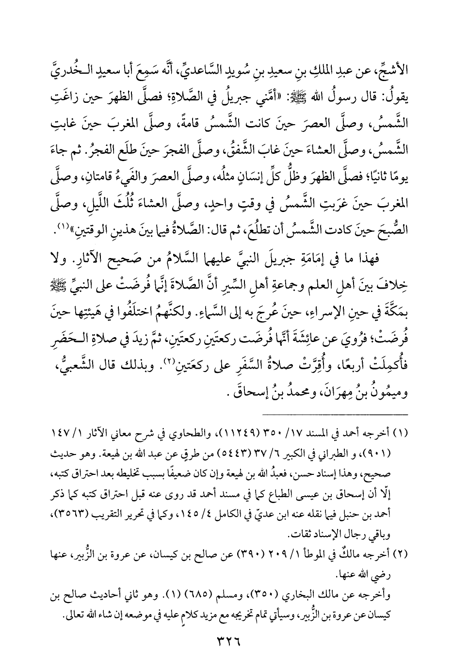 فهذا ما في إمَامَةِ جبريلَ النبيَّ عليهما السَّلامُ من صَحيح الآثارِ. ولا خِلافَ بينَ أهلِ العلم وجماعةِ أهلِ السِّيرِ أنَّ الصَّلاةَ إنَّما فُرضَتْ على النبيِّ - صلى الله عليه وسلم - بمَكَّةَ في حينِ الإسراءِ، حينَ عُرجَ به إلى السَّماءِ. ولكنَّهمُ اختلَفُوا في هَيئتِها حينَ فُرضَتْ؛ فرُويَ عن عائِشَةَ أنَّها فُرضَت ركعتَينِ ركعتَينِ، ثمَّ زيدَ في صلاةِ الحَضَرِ فأُكمِلَتْ أربعًا، وأُقِرَّتْ صلاةُ السَّفَرِ على ركعَتينِ (¬٢). وبذلك قال الشَّعبيُّ، وميمُونُ بنُ مِهرَانَ، ومحمدُ بنُ إسحاقَ.