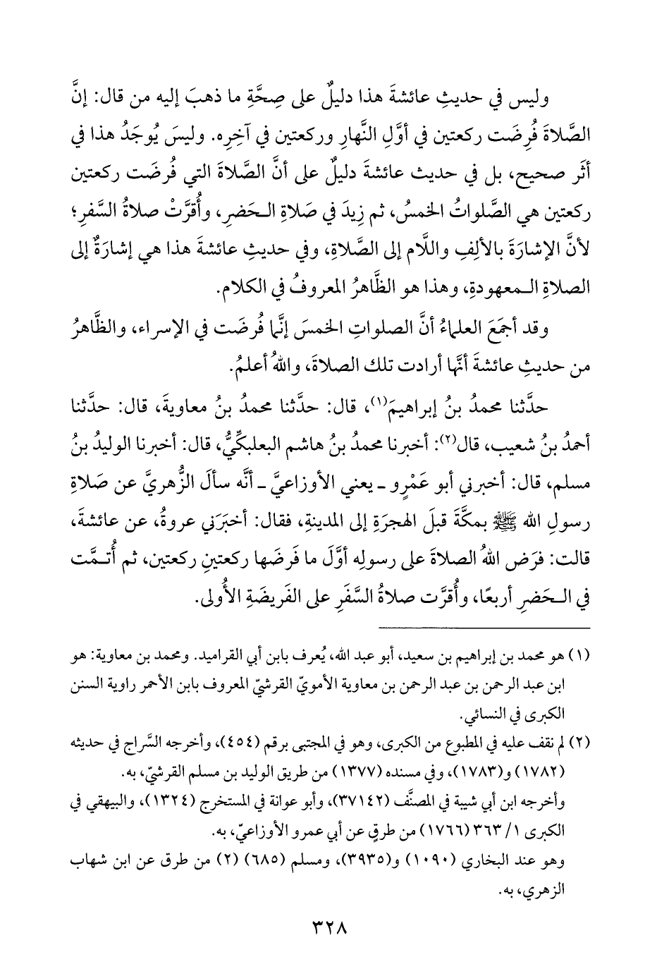 حدَّثنا محمدُ بنُ إبراهيمَ (¬١)، قال: حدَّثنا محمدُ بنُ معاويةَ، قال: حدَّثنا أحمدُ بنُ شعيب، قال (¬٢): أخبرنا محمدُ بنُ هاشم البعلبكِّيُّ، قال: أخبرنا الوليدُ بنُ مسلم، قال: أخبرني أبو عَمْرٍو - يعني الأوزاعيَّ - أنَّه سألَ الزُّهريَّ عن صَلاةِ رسولِ الله - صلى الله عليه وسلم - بمكَّةَ قبلَ الهجرَةِ إلى المدينةِ، فقال: أخبَرَني عروةُ، عن عائشةَ، قالت: فرَض اللهُ الصلاةَ على رسولِه أوَّلَ ما فَرضَها ركعتينِ ركعتين، ثم أُتمَّت في الحَضرِ أربعًا، وأُقرَّت صلاةُ السَّفَرِ على الفَريضَةِ الأُولى.