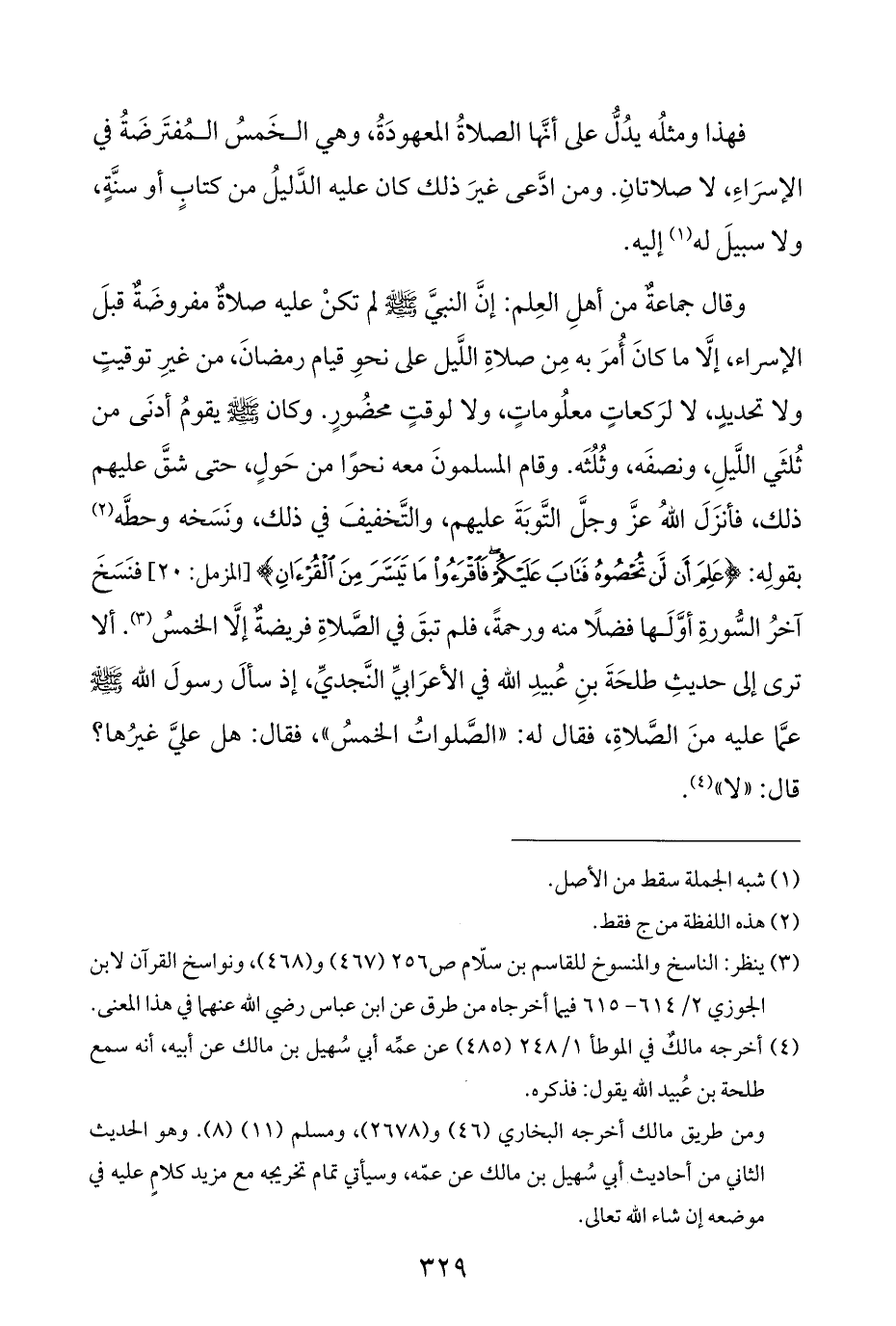 وقال جماعةٌ من أهلِ العِلم: إنَّ النبيَّ - صلى الله عليه وسلم - لم تكنْ عليه صلاةٌ مفروضَةٌ قبلَ الإسراء، إلَّا ما كانَ أُمرَ به مِن صلاةِ اللَّيل على نحوِ قيام رمضانَ، من غيرِ توقيتٍ ولا تحديدٍ، لا لرَكعاتٍ معلُوماتٍ، ولا لوقتٍ محضُورٍ. وكان - صلى الله عليه وسلم - يقومُ أدنَى من ثُلثَي اللَّيلِ، ونصفَه، وثُلُثَه. وقام المسلمونَ معه نحوًا من حَولٍ، حتى شقَّ عليهم ذلك، فأنزَلَ اللهُ عزَّ وجلَّ التَّوبَةَ عليهم، والتَّخفيفَ في ذلك، ونَسَخه وحطَّه (¬٢) بقولِه: {عَلِمَ أَنْ لَنْ تُحْصُوهُ فَتَابَ عَلَيْكُمْ فَاقْرَءُوا مَا تَيَسَّرَ مِنَ الْقُرْآنِ} [المزمل: ٢٠] فنَسَخَ آخرُ السُّورةِ أوَّلَها فضلًا منه ورحمةً، فلم تبقَ في الصَّلاةِ فريضةٌ إلَّا الخمسُ (¬٣). ألا ترى إلى حديثِ طلحَةَ بنِ عُبيدِ الله في الأعرَابيِّ النَّجديِّ، إذ سألَ رسولَ الله - صلى الله عليه وسلم - عمَّا عليه منَ الصَّلاةِ، فقال له: "الصَّلواتُ الخمسُ"، فقال: هل عليَّ غيرُها؟ قال: "لا" (¬٤).