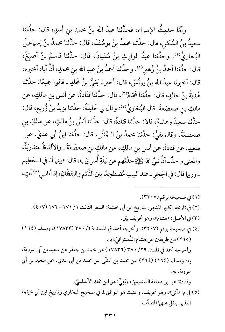 وأمَّا حديثُ الإسراء، فحدَّثنا عبدُ الله بنُ محمدِ بنِ أسدٍ، قال: حدَّثنا سعيدُ بنُ السَّكنِ، قال: حدَّثنا محمدُ بنُ يوسُفَ، قال: حدَّثنا محمدُ بنُ إسماعيلَ البُخاريُّ (¬١). وحدَّثنا عبدُ الوارِثِ بنُ سُفيانَ، قال: حدَّثنا قاسمُ بنُ أصبَغَ، قال: حدَّثنا أحمدُ بنُ زُهيرٍ (¬٢). وحدَّثنا أحمدُ بنُ عبدِ الله بنِ محمدٍ، أنَّ أباه أخبره، قال: أخبرنا عبدُ الله بنُ يونُسَ، قال: أخبرنا بَقيُّ بنُ مخَلدٍ - قالوا جميعًا: حدَّثنا هُدبَةُ بنُ خالدٍ، قال: حدَّثنا هَمّامٌ (¬٣)، قال: حدَّثنا قتَادةُ، عن أنس بنِ مالكٍ، عن مالكِ بنِ صعصَعةَ. قال البُخاريُّ (¬٤): وقال لي خَليفَةُ: حدَّثنا يزيدُ بنُ زُريع، قال: حدَّثنا سعيدٌ وهشامٌ، قالا: حدَّثنا قتادةُ، قال: حدَّثنا أنسُ بنُ مالكٍ، عن مالكِ بنِ صعصعَةَ. وقال بقيٌّ: حدَّثنا محمدُ بنُ المُثنَّى، قال: حدَّثنا ابنُ أبي عديِّ، عن سعيدٍ، عن قتادةَ، عن أنسِ بنِ مالكٍ، عن مالكِ بنِ صعصَعَةَ - والألفاظُ متقاربَةٌ، والمعنى واحدٌ - أنَّ نبيَّ الله - صلى الله عليه وسلم - حدَّثهم عن ليلَةِ أُسريَ به، قال: "بينما أنا في الحَطِيم - وربما قال: في الحِجرِ - عند البيتِ مُضطجِعًا بين النَّائم واليقظَانِ، إذ أتاني (¬٥) آتٍ،