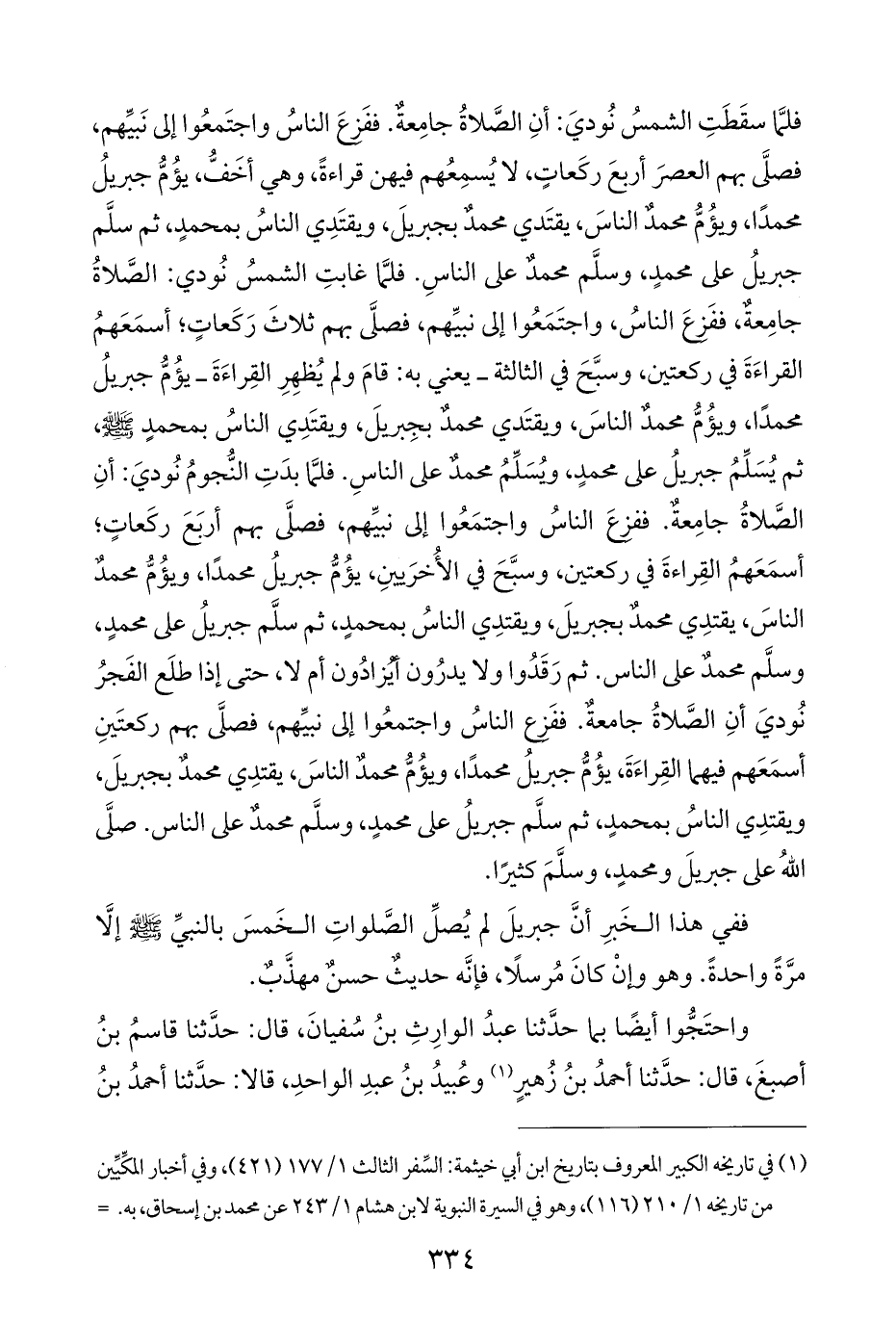 ففي هذا الخَبرِ أنَّ جبريلَ لم يُصلِّ الصَّلواتِ الخَمسَ بالنبيِّ - صلى الله عليه وسلم - إلَّا مرَّةً واحدةً. وهو وإنْ كانَ مُرسلًا، فإنَّه حديثٌ حسنٌ مهذَّبٌ.