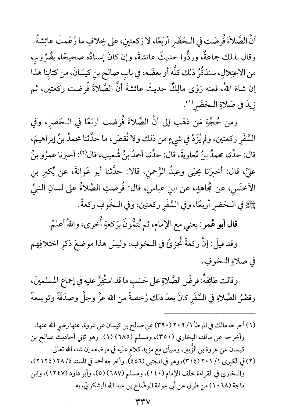 أنَّ الصَّلاةَ فُرضَت في الحَضَرِ أربَعًا، لا رَكعتينِ، على خِلافِ ما زَعَمتْ عائِشةُ. وقال بذلك جماعةٌ، وردُّوا حديثَ عائشةَ، وإن كانَ إسنادُه صحيحًا، بضُرُوبٍ من الاعتِلالِ، سنذكُرُ ذلك كلَّه أو بعضه، في بابِ صالح بنِ كيسَانَ، من كتابِنا هذا إن شاءَ اللهُ، فعنه رَوَى مالِكٌ حديثَ عائشةَ أنَّ الصَّلاةَ فُرضت ركعتين، ثم زِيدَ في صَلاةِ الحَضَر (¬١).