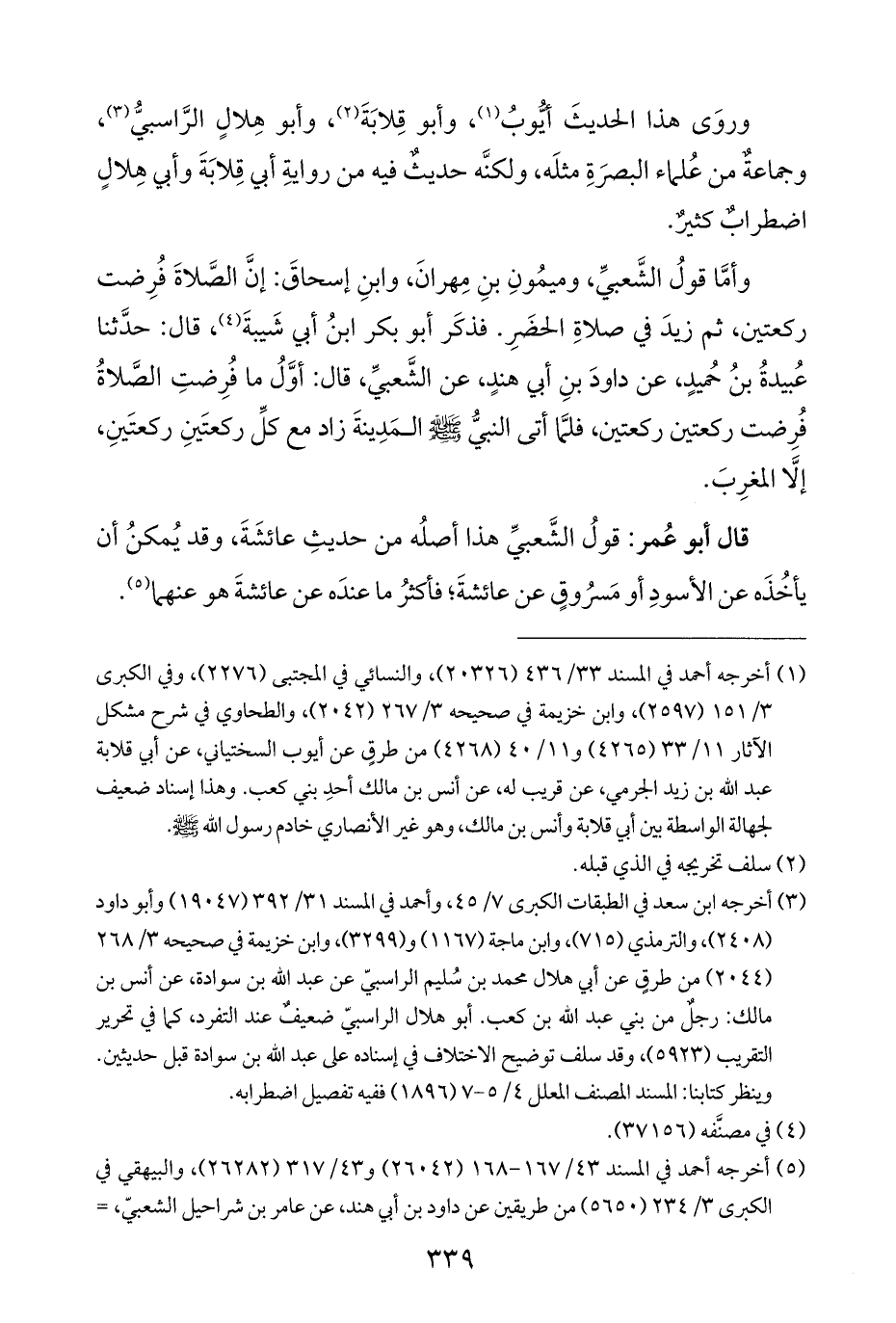 وأمَّا قولُ الشَّعبيِّ، وميمُونِ بنِ مِهرانَ، وابنِ إسحاقَ: إنَّ الصَّلاةَ فُرِضت ركعتين، ثم زيدَ في صلاةِ الحضَرِ. فذكَر أبو بكر بنُ أبي شَيبةَ (¬٤)، قال: حدَّثنا عُبيدةُ بنُ حُميدٍ، عن داودَ بنِ أبي هندٍ، عن الشَّعبيِّ، قال: أوَّلُ ما فُرِضتِ الصَّلاةُ فُرِضت ركعتين ركعتين، فلمَّا أتى النبيُّ - صلى الله عليه وسلم - المَدِينةَ زاد مع كلِّ ركعتَينِ ركعتَينِ، إلَّا المغرِبَ.