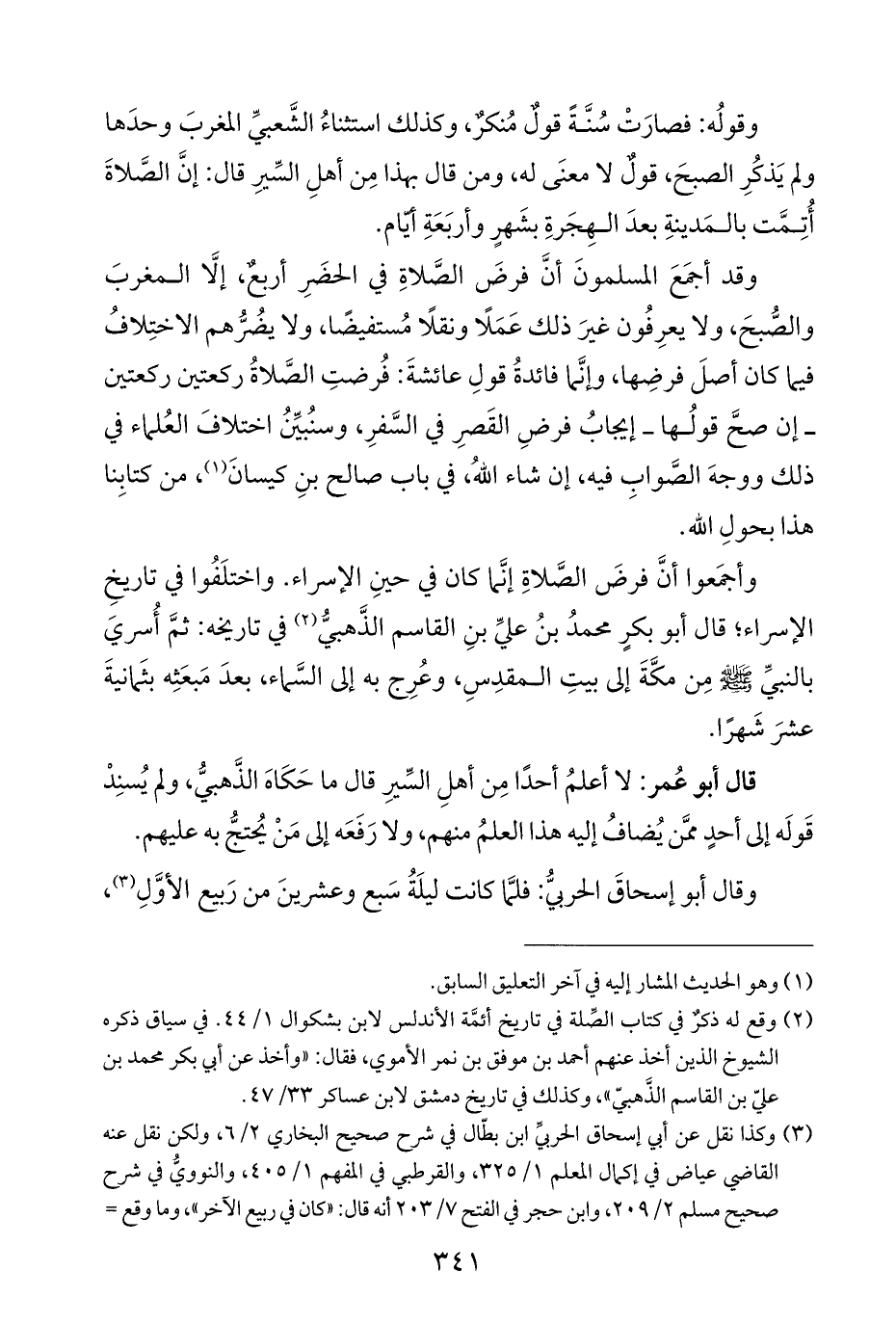 وقولُه: فصارَتْ سُنَّةً قولٌ مُنكرٌ، وكذلك استثناءُ الشَّعبيِّ المغربَ وحدَها ولم يَذكُرِ الصبحَ، قولٌ لا معنَى له، ومن قال بهذا مِن أهلِ السِّيرِ قال: إنَّ الصَّلاةَ أُتِمَّت بالمَدينةِ بعدَ الهِجَرةِ بشَهرٍ وأربَعَةِ أيّام.