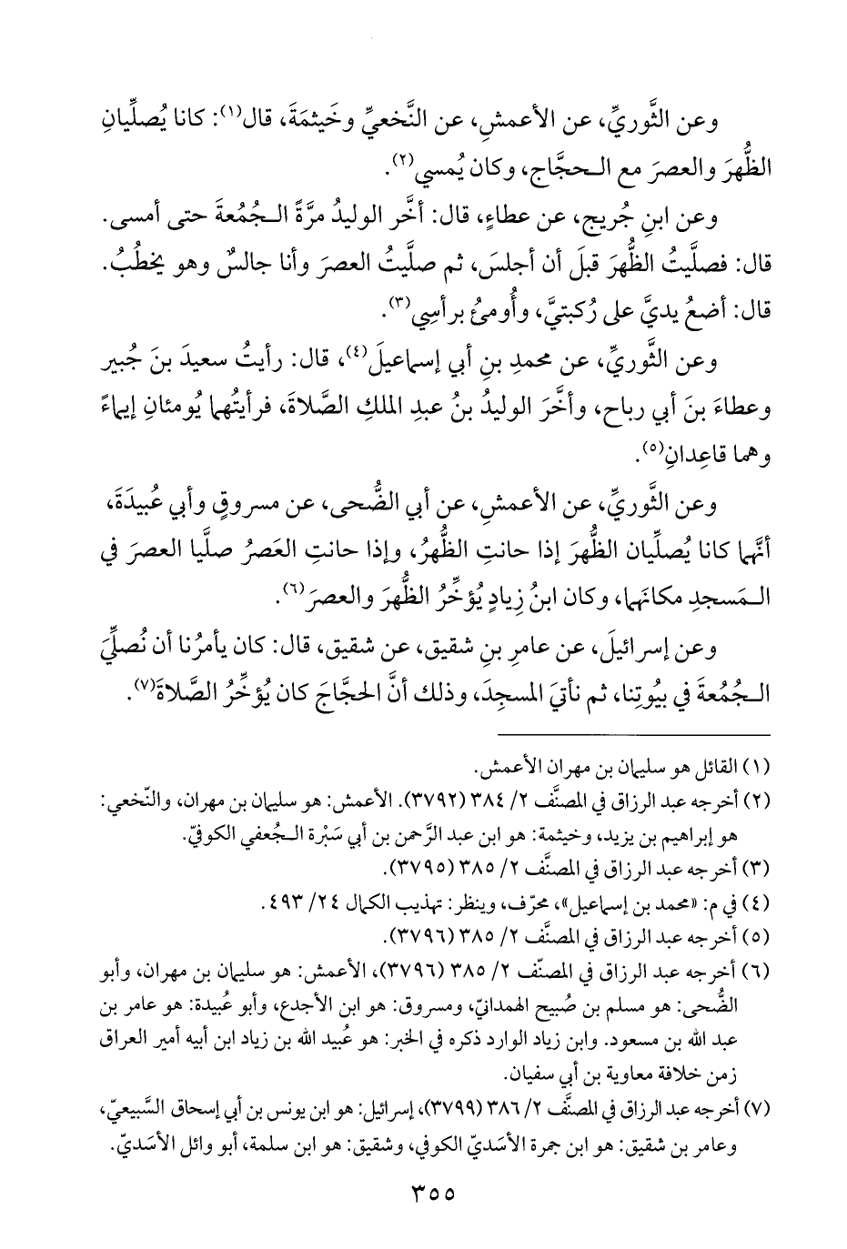 (¬٧) أخرجه عبد الرزاق في المصنَّف ٢/ ٣٨٦ (٣٧٩٩)، إسرائيل: هو ابن يونس بن أبي إسحاق السَّبيعيّ، وعامر بن شقيق: هو ابن جمرة الأسَديّ الكوفي، وشقيق: هو ابن سلمة، أبو وائل الأسَديّ.