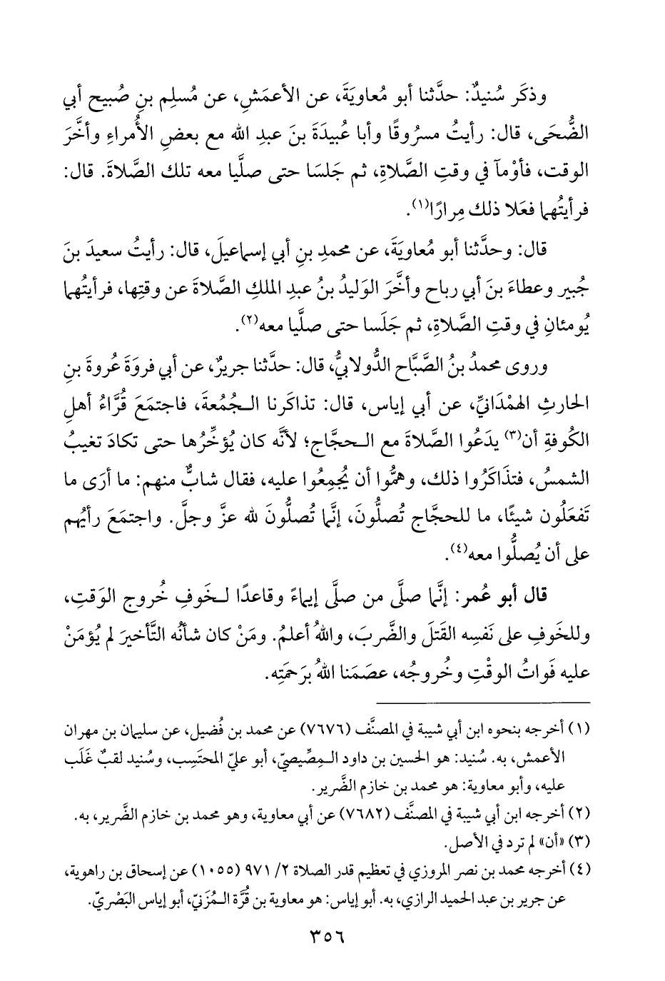 وذكَر سُنيدٌ: حدَّثنا أبو مُعاويَةَ، عن الأعمَشِ، عن مُسلِم بنِ صُبيح أبي الضُّحَى، قال: رأيتُ مسرُوقًا وأبا عُبيد لنَ عبدِ الله مع بعضِ الأُمراءِ وأخَّرَ الوقت، فأوْمآ في وقتِ الصَّلاةِ، ثم جَلسَا حتى صلَّيا معه تلك الصَّلاةَ. قال: فرأيتُهما فعَلا ذلك مِرارًا (¬١).