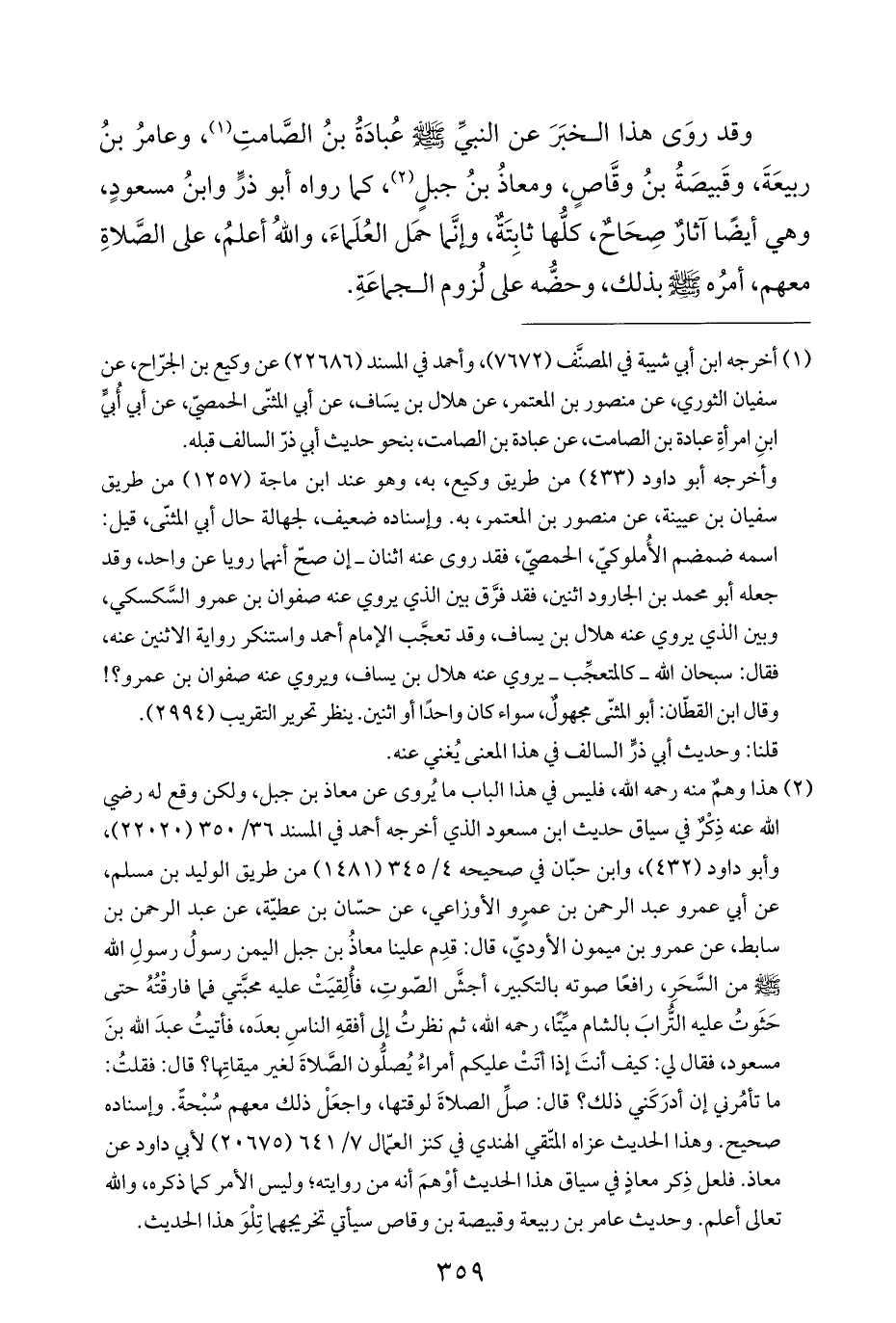 (¬٢) هذا وهمٌ منه رحمه الله، فليس في هذا الباب ما يُروى عن معاذ بن جبل، ولكن وقع له رضي الله عنه ذِكْرٌ في سياق حديث ابن مسعود الذي أخرجه أحمد في المسند ٣٦/ ٣٥٠ (٢٢٠٢٠)، وأبو داود (٤٣٢)، وابن حبّان في صحيحه ٤/ ٣٤٥ (١٤٨١) من طريق الوليد بن مسلم، عن أبي عمرو عبد الرحمن بن عمرٍو الأوزاعي، عن حسّان بن عطيّة، عن عبد الرحمن بن سابط، عن عمرو بن ميمون الأوديّ، قال: قدِم علينا معاذُ بن جبل اليمن رسولُ رسولِ الله - صلى الله عليه وسلم - من السَّحَرِ، رافعًا صوته بالتكبير، أجشَّ الصّوتِ، فأُلِقيَتْ عليه محبَّتي فما فارقْتُهُ حتى حَثَوتُ عليه التُّرابَ بالشام ميِّتًا، رحمه الله، ثم نظرتُ إلى أفقهِ الناسِ بعدَه، فأتيتُ عبدَ الله بنَ مسعود، فقال لي: كيف أنتَ إذا أتَتْ عليكم أمراءُ يُصلُّون الصَّلاةَ لغير ميقاتِها؟ قال: فقلتُ: ما تأمُرني إن أدرَكَني ذلك؟ قال: صلِّ الصلاةَ لوقتها، واجعَلْ ذلك معهم سُبْحةً. وإسناده صحيح. وهذا الحديث عزاه المتّقي الهندي في كنز العمّال ٧/ ٦٤١ (٢٠٦٧٥) لأبي داود عن معاذ. فلعل ذِكر معاذٍ في سياق هذا الحديث أوْهمَ أنه من روايته؛ وليس الأمر كما ذكره، والله تعالى أعلم. وحديث عامر بن ربيعة وقبيصة بن وقاص سيأتي تخريجهما تِلْوَ هذا الحديث.