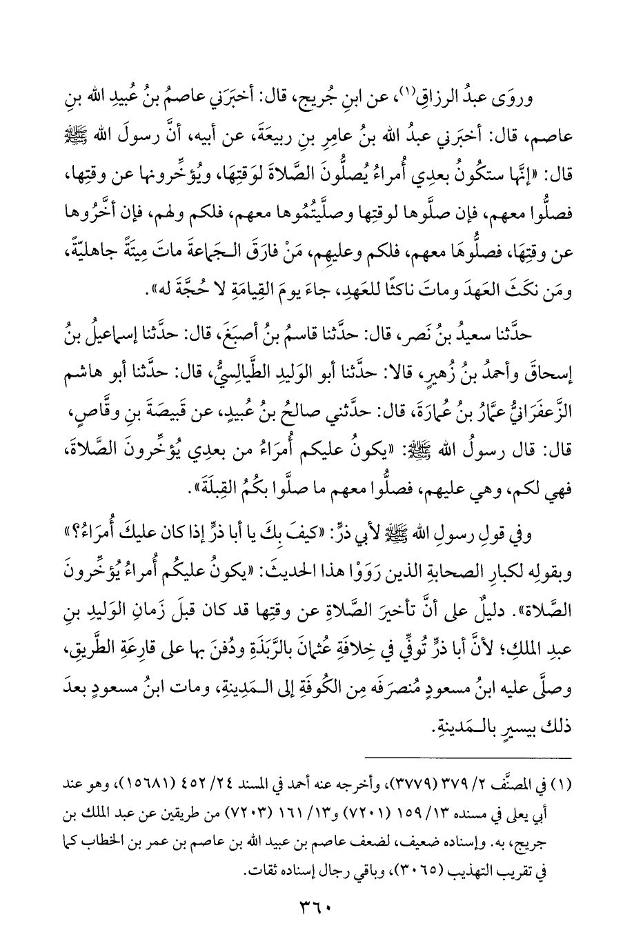 وفي قولِ رسولِ الله - صلى الله عليه وسلم - لأبي ذرٍّ: "كيفَ بِكَ يا أبا ذرٍّ إذا كان عليكَ أُمرَاءُ؟ " وبقولِه لكبارِ الصحابةِ الذين رَوَوْا هذا الحديثَ: "يكونُ عليكُم أُمراءُ يُؤخِّرونَ الصَّلاة". دليلٌ على أنَّ تأخيرَ الصَّلاةِ عن وقتِها قد كان قبلَ زَمانِ الوَليدِ بنِ عبدِ الملكِ؛ لأنَّ أبا ذرٍّ تُوفِّي في خِلافَةِ عُثمانَ بالرَّبَذَةِ ودُفنَ بها على قارِعَةِ الطَّريقِ، وصلَّى عليه ابنُ مسعودٍ مُنصرَفَه مِن الكُوفَةِ إلى المَدِينةِ، ومات ابنُ مسعودٍ بعدَ ذلك بيسيرٍ بالمَدينةِ.