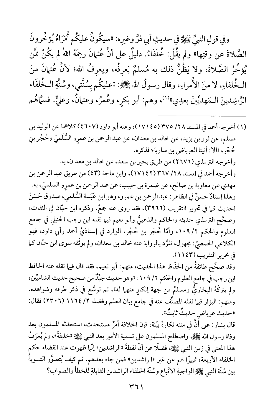 وفي قولِ النبيِّ - صلى الله عليه وسلم - في حديثِ أبي ذرٍّ وغيرِه: "سيكُونُ عليكُم أُمَرَاءُ يُؤخِّرونَ الصَّلاةَ عن وقتِها" ولم يقُلْ: خُلَفَاءُ. دليلٌ على أنَّ عُثمانَ رحِمَهُ اللهُ لم يكُنْ ممَّن يُؤخِّرُ الصَّلاةَ، ولا يَظُنُّ ذلك به مُسلمٌ يَعرِفُه، ويعرِفُ الله؛ لأنَّ عُثمانَ منَ الخُلفاءِ، لا منَ الأُمراءِ، وقال رسولُ الله - صلى الله عليه وسلم -: "عليكُم بِسُنَّتي، وسُنَّةِ الخُلفَاء الرَّاشِدينَ المَهديِّينَ بعدِي" (¬١)، وهم: أبو بكرٍ، وعُمرُ، وعثمانُ، وعليٌّ. فسمَّاهُم