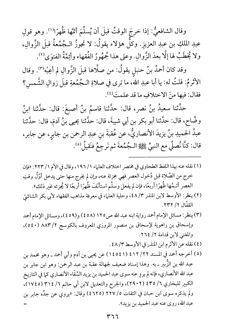 حدَّثنا سعيدُ بنُ نصر، قال: حدَّثنا قاسمُ بنُ أصبغَ: قال: حدَّثنا ابنُ وضَّاح، قال: حدَّثنا أبو بكر بن أبي شيبةَ، قال: حدَّثنا يحيى بنُ آدمَ، قال: حدَّثنا عبدُ الحميدِ بنُ يزيدَ الأنصاريُّ، عن عُقبةَ بنِ عبدِ الرحمن بن جابرٍ، عن جابر، قال: كنَّا نُصلِّي مع النبيِّ - صلى الله عليه وسلم - الجُمُعةَ ثم نَرجِعُ فنَقيلُ (¬٥).