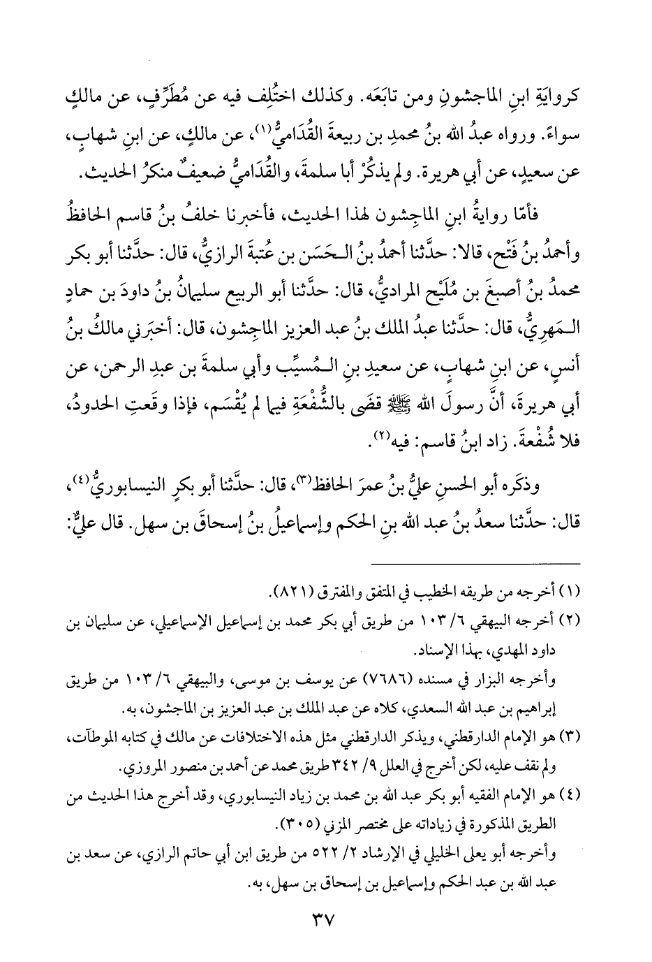 (¬٣) هو الإمام الدارقطني، ويذكر الدارقطني مثل هذه الاختلافات عن مالك في كتابه الموطآت، ولم نقف عليه، لكن أخرج في العلل ٩/ ٣٤٢ طريق محمد عن أحمد بن منصور المروزي.