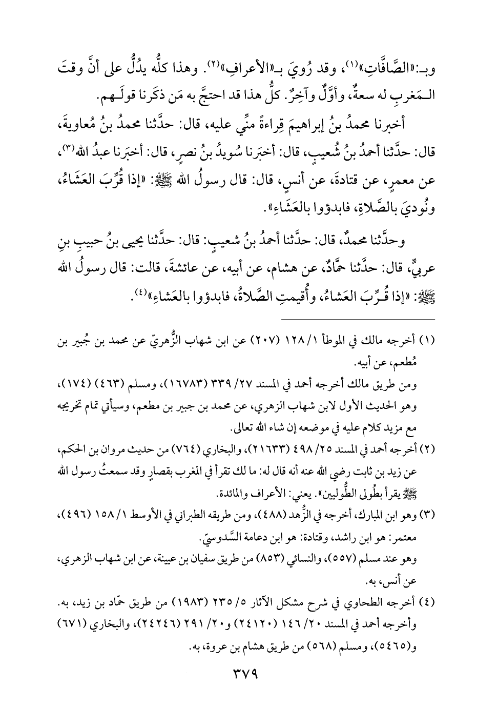 وبـ: "الصافَّاتِ" (¬١)، وقد رُويَ بـ "الأعرافِ" (¬٢). وهذا كلُّه يدُلُّ على أنَّ وقتَ المَغربِ له سعةٌ، وأوَّلٌ وآخِرٌ. كلُّ هذا قد احتجَّ به مَن ذكَرنا قولَهم.