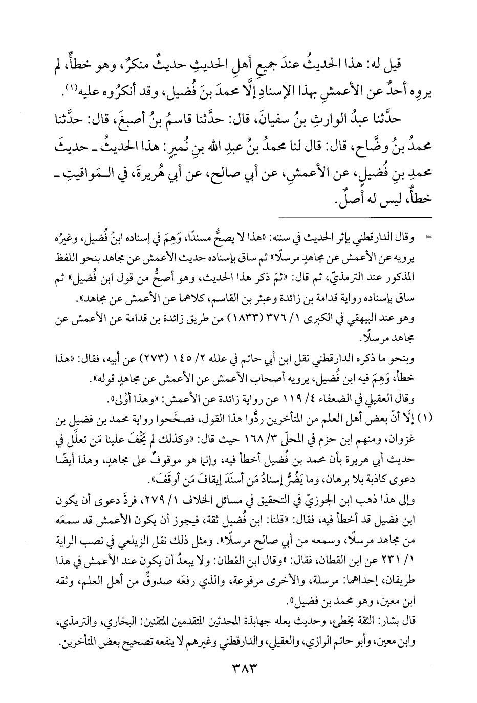 (¬١) إلّا أنّ بعض أهل العلم من المتأخرين ردُّوا هذا القول، فصحَّحوا رواية محمد بن فضيل بن غزوان، ومنهم ابن حزم في المحلّى ٣/ ١٦٨ حيث قال: "وكذلك لم يَخْفَ علينا مَن تعلَّل في حديث أبي هريرة بأن محمد بن فُضيل أخطأ فيه، وإنما هو موقوفٌ على مجاهدٍ، وهذا أيضًا دعوى كاذبة بلا برهان، وما يَضُرُّ إسنادُ مَن أسنَدَ إيقافَ مَن أوقَفَ".