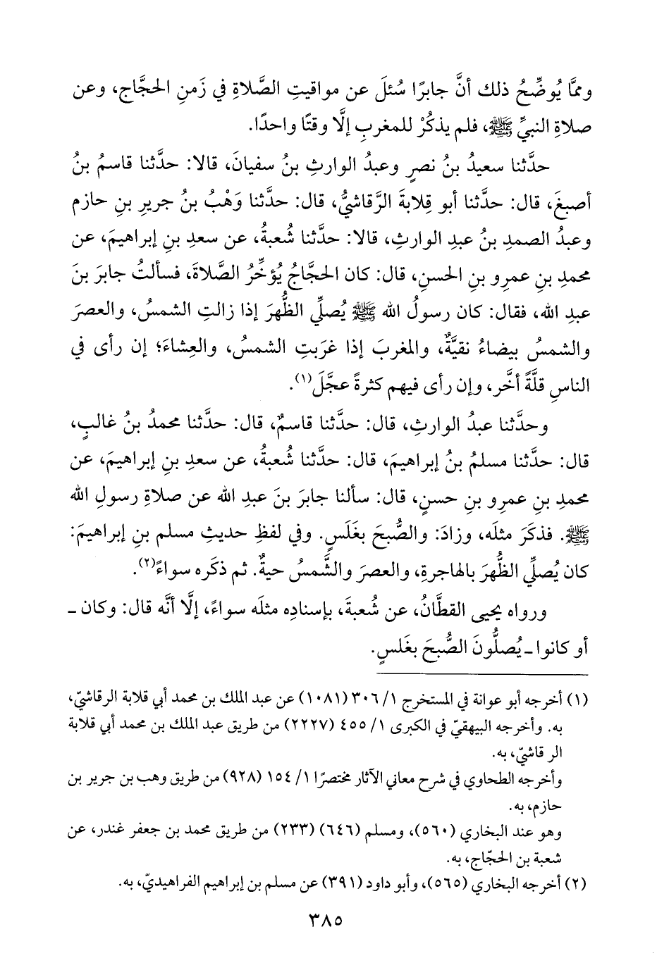 حدَّثنا سعيدُ بنُ نصرٍ وعبدُ الوارثِ بنُ سفيانَ، قالا: حدَّثنا قاسمُ بنُ أصبغَ، قال: حدَّثنا أبو قِلابةَ الرَّقاشيُّ، قال: حدَّثنا وَهْبُ بنُ جريرِ بنِ حازم وعبدُ الصمدِ بنُ عبدِ الوارثِ، قالا: حدَّثنا شُعبةُ، عن سعدِ بنِ إبراهيمَ، عن محمدِ بنِ عمرِو بنِ الحسنِ، قال: كان الحجَّاجُ يُؤخِّرُ الصَّلاةَ، فسألتُ جابرَ بنَ عبدِ الله، فقال: كان رسولُ الله - صلى الله عليه وسلم - يُصلِّي الظُّهرَ إذا زالتِ الشمسُ، والعصرَ والشمسُ بيضاءُ نقيَّةٌ، والمغربَ إذا غرَبتِ الشمسُ، والعِشاءَ؛ إن رأى في الناسِ قلَّةً أخَّر، وإن رأى فيهم كثرةً عجَّلَ (¬١).
