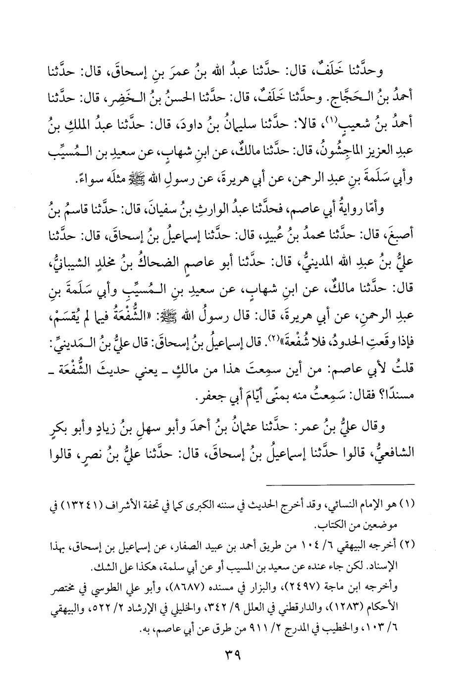 وأمّا روايةُ أبي عاصم، فحدَّثنا عبدُ الوارثِ بنُ سفيانَ، قال: حدَّثنا قاسمُ بنُ أصبغَ، قال: حدَّثنا محمدُ بنُ عُبيدٍ، قال: حدَّثنا إسماعيلُ بنُ إسحاقَ، قال: حدَّثنا عليُّ بنُ عبدِ الله المدينيُّ، قال: حدَّثنا أبو عاصمٍ الضحاكُ بنُ مخلدٍ الشيبانيُّ، قال: حدَّثنا مالكٌ، عن ابنِ شهابٍ، عن سعيدِ بنِ المُسيِّبِ وأبي سَلَمةَ بنِ عبدِ الرحمنِ، عن أبي هريرةَ، قال: قال رسولُ الله - صلى الله عليه وسلم -: "الشُّفْعَةُ فيما لم يُقسَمْ، فإذا وقَعتِ الحدودُ، فلا شُفْعةَ" (¬٢). قال إسماعيلُ بنُ إسحاقَ: قال عليُّ بنُ المَدينيِّ: قلتُ لأبي عاصم: من أين سمِعتَ هذا من مالكٍ - يعني حديثَ الشُّفْعَة - مسندًا؟ فقال: سَمِعتُ منه بمنًى أيّامَ أبي جعفر.
