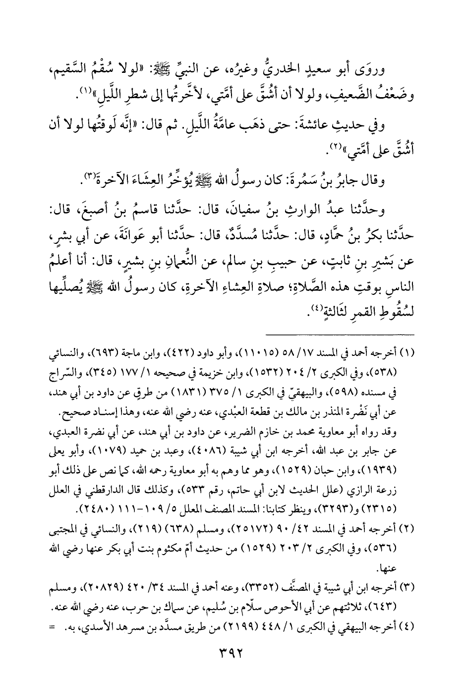 وحدَّثنا عبدُ الوارثِ بنُ سفيانَ، قال: حدَّثنا قاسمُ بنُ أصبغَ، قال: حدَّثنا بكرُ بنُ حمَّادٍ، قال: حدَّثنا مُسدَّدٌ، قال: حدَّثنا أبو عَوانَةَ، عن أبي بشرٍ، عن بَشيرِ بنِ ثابتٍ، عن حبيبِ بنِ سالم، عن النُّعمانِ بنِ بشيرٍ، قال: أنا أعلمُ الناسِ بوقتِ هذه الصَّلاةِ؛ صلاةِ العِشاءِ الآخرةِ، كان رسولُ الله - صلى الله عليه وسلم - يُصلِّيها لسُقُوطِ القمرِ لثَالثةٍ (¬٤).