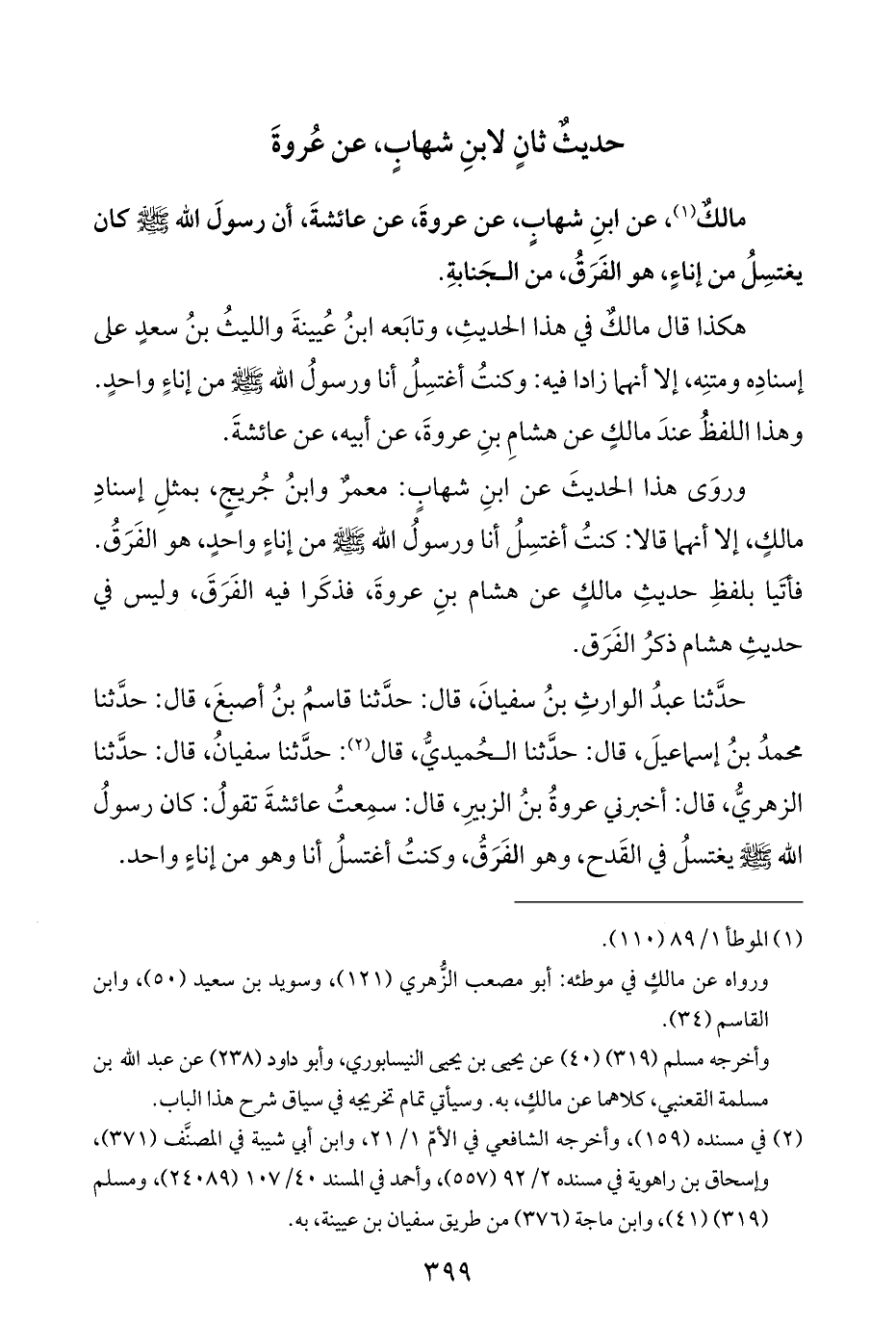 مالكٌ (¬١)، عن ابنِ شهابٍ، عن عروةَ، عن عائشةَ، أن رسولَ الله - صلى الله عليه وسلم - كان يغتسِلُ من إناءٍ، هو الفَرَقُ، من الجَنابةِ.