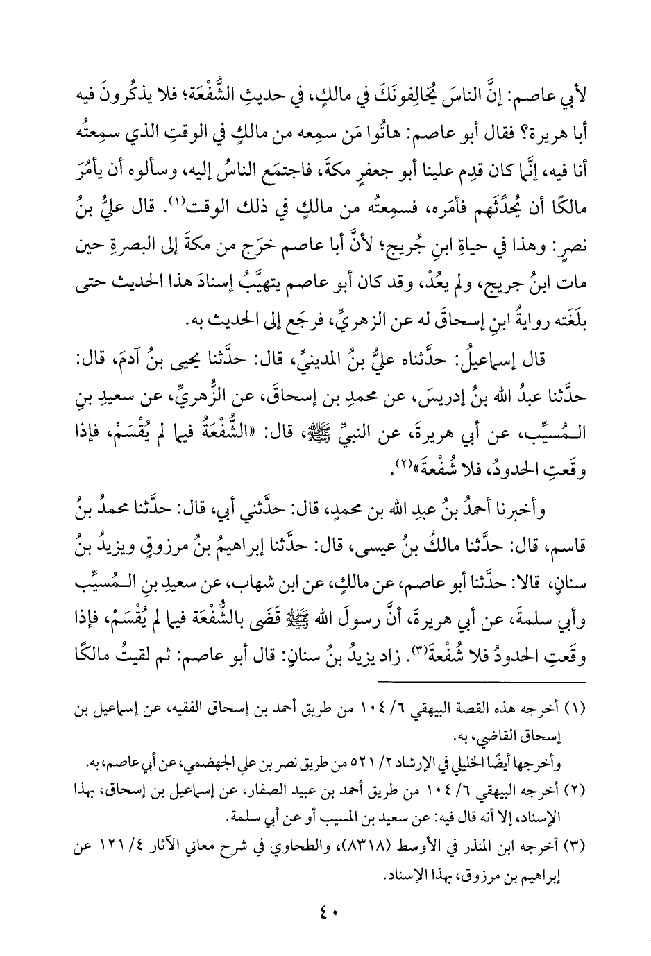 لأبي عاصم: إنَّ الناسَ يُخالِفونَكَ في مالكٍ، في حديثِ الشُّفْعَة؛ فلا يذكُرونَ فيه أبا هريرة؟ فقال أبو عاصم: هاتُوا مَن سمِعه من مالكٍ في الوقتِ الذي سمِعتُه أنا فيه، إنَّما كان قدِم علينا أبو جعفرٍ مكةَ، فاجتمَع الناسُ إليه، وسألوه أن يأمُرَ مالكًا أن يُحدِّثَهم فأمَره، فسمِعتُه من مالكٍ في ذلك الوقت (¬١). قال عليُّ بنُ نصرٍ: وهذا في حياةِ ابنِ جُريج؛ لأنَّ أبا عاصم خرَج من مكةَ إلى البصرةِ حين مات ابنُ جريج، ولم يعُدْ، وقد كان أبو عاصم يتهيَّبُ إسنادَ هذا الحديث حتى بلَغَته روايةُ ابنِ إسحاقَ له عن الزهريِّ، فرجَع إلى الحديث به.