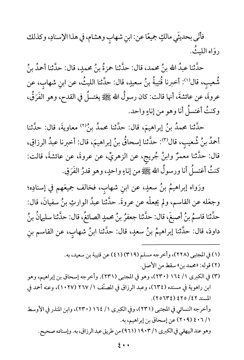 حدَّثنا محمدُ بنُ إبراهيمَ، قال: حدَّثنا محمدُ بنُ (¬٢) معاويةَ، قال: حدَّثنا أحمدُ بنُ شُعيبٍ، قال (¬٣): حدَّثنا إسحاقُ بنُ إبراهيمَ، قال: أخبرنا عبدُ الرزاقِ، قال: حدَّثنا معمرٌ وابنُ جُريجٍ، عن الزهريِّ، عن عروةَ، عن عائشةَ، قالت: كنتُ أغتسلُ أنا ورسولُ الله - صلى الله عليه وسلم - من إناءٍ واحدٍ، وهو قدرُ الفَرَقِ.