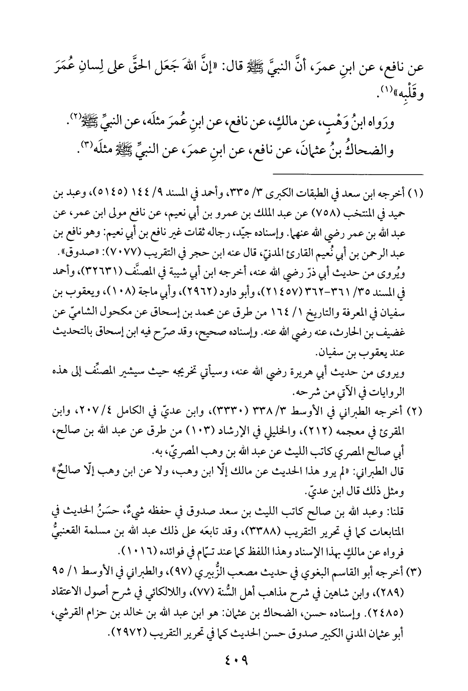 عن نافع، عن ابنِ عمرَ، أنَّ النبيَّ - صلى الله عليه وسلم - قال: "إنَّ اللهَ جَعَل الحقَّ على لِسانِ عُمَرَ وقَلْبِه" (¬١).