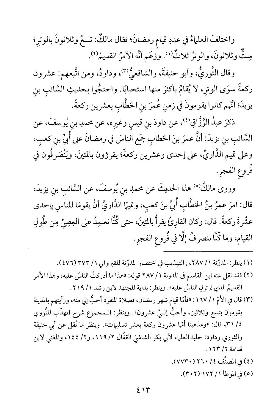 (¬٣) قال في الأمّ ١/ ١٦٧: "فأمّا قيام شهر رمضان، فصلاة المنفرد أحبُّ إلي منه، ورأيتهم بالمدينة يقومون بتسع وثلاثين، وأحبُّ إليَّ عشرون". وينظر: المجموع شرح المهذّب للنَّووي ٤/ ٣١، قال: "ومذهبنا أنّها عشرون ركعة بعشر تسليمات". وينظر ما نُقل عن أبي حنيفة والثوري وداود: حلية العلماء لأبي بكر الشاشيّ القفّال ٢/ ١١٩، و ٢/ ١٤٤، والمغني لابن قدامة ٢/ ١٢٣.
