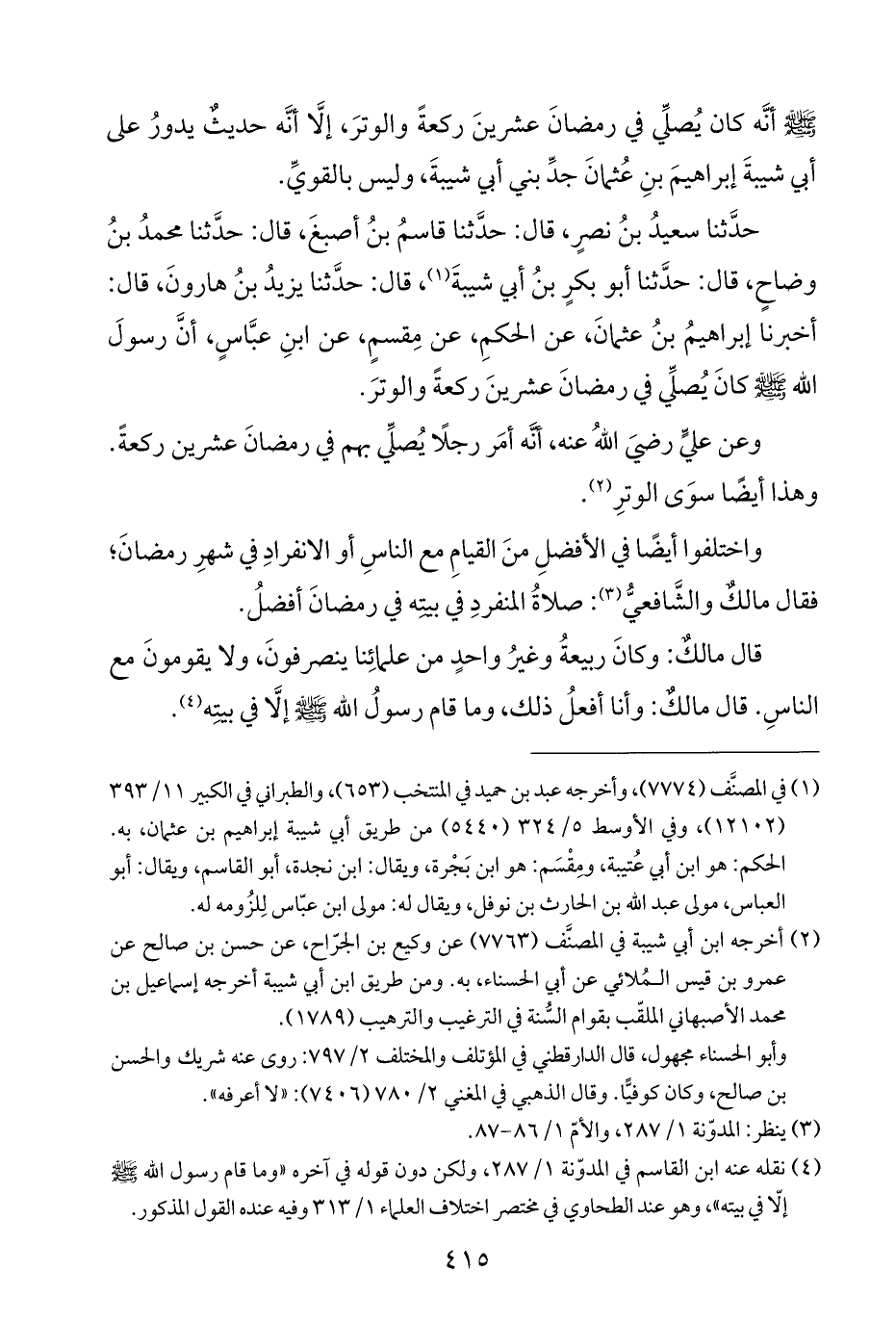 حدَّثنا سعيدُ بنُ نصرٍ، قال: حدَّثنا قاسمُ بنُ أصبغَ، قال: حدَّثنا محمدُ بنُ وضاحٍ، قال: حدَّثنا أبو بكرٍ بنُ أبي شيبةَ (¬١)، قال: حدَّثنا يزيدُ بنُ هارونَ، قال: أخبرنا إبراهيمُ بنُ عثمانَ، عن الحكمِ، عن مِقسمٍ، عن ابنِ عبَّاسٍ، أنَّ رسولَ الله - صلى الله عليه وسلم - كانَ يُصلِّي في رمضانَ عشرينَ ركعةً والوترَ.