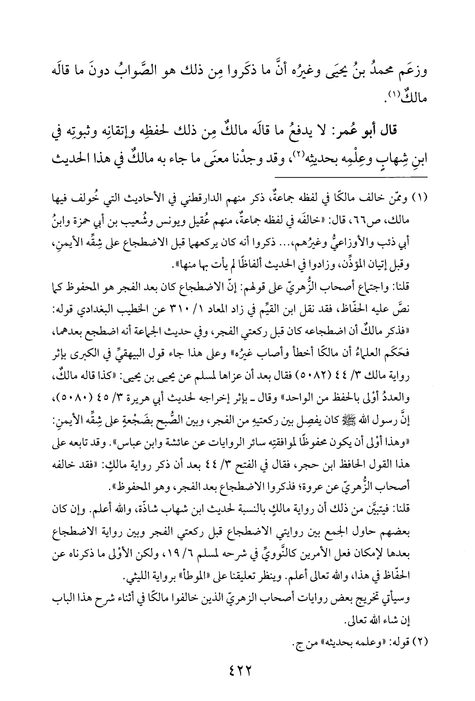 قلنا: واجتماع أصحاب الزُّهريّ على قولهم: إنّ الاضطجاع كان بعد الفجر هو المحفوظ كما نصَّ عليه الحفّاظ، فقد نقل ابن القيِّم في زاد المعاد ١/ ٣١٠ عن الخطيب البغدادي قوله: "فذكر مالكٌ أن اضطجاعه كان قبل ركعتي الفجر، وفي حديث الجماعة أنه اضطجع بعدهما، فحَكَم العلماءُ أن مالكًا أخطأ وأصاب غيرُه" وعلى هذا جاء قول البيهقيِّ في الكبرى بإثر رواية مالك ٣/ ٤٤ (٥٠٨٢) فقال بعد أن عزاها لمسلم عن يحيى بن يحيى: "كذا قاله مالكٌ، والعددُ أوْلى بالحفظ من الواحد" وقال - بإثر إخراجه لحديث أبي هريرة ٣/ ٤٥ (٥٠٨٠)، إنَّ رسول الله - صلى الله عليه وسلم - كان يفصِل بين ركعتيهِ من الفجر، وبين الصُّبح بضَجْعةٍ على شِقِّه الأيمنِ: "وهذا أوْلى أن يكون محفوظًا لموافقتِه سائر الروايات عن عائشة وابن عباس". وقد تابعه على هذا القول الحافظ ابن حجر، فقال في الفتح ٣/ ٤٤ بعد أن ذكر رواية مالكٍ: "فقد خالفه أصحاب الزُّهريّ عن عروة؛ فذكروا الاضطجاع بعد الفجر، وهو المحفوظ".
