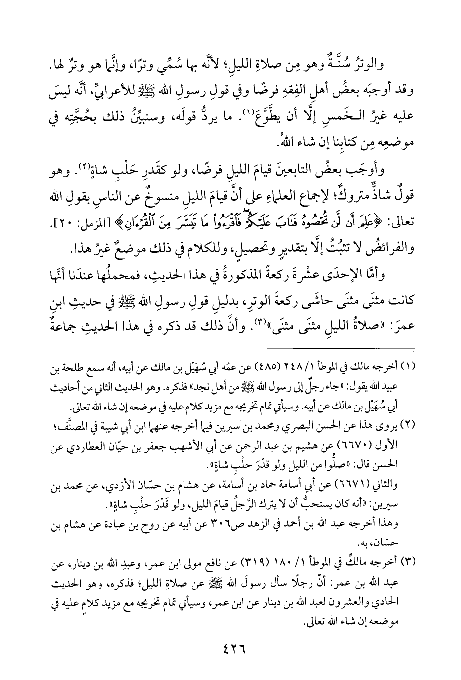 والوترُ سنَّةٌ وهو مِن صلاةِ الليلِ؛ لأنَّه بها سُمِّي وترًا، وإنَّما هو وترٌ لها. وقد أوجبَه بعضُ أهلِ الفِقهِ فرضًا وفي قولِ رسولِ الله - صلى الله عليه وسلم - للأعرابيِّ، أنَّه ليسَ عليه غيرُ الخَمسِ إلَّا أن يطَّوَّعَ (¬١). ما يردُّ قولَه، وسنبيِّنُ ذلك بحُجَّتِه في موضعِه مِن كتابِنا إن شاء اللهُ.